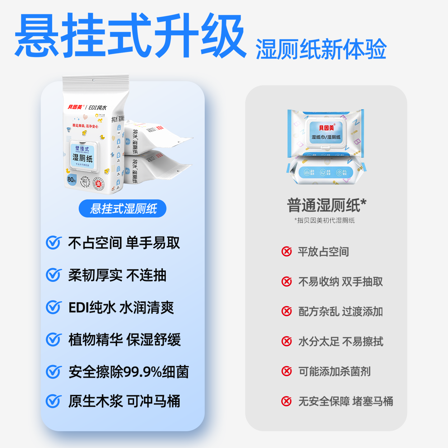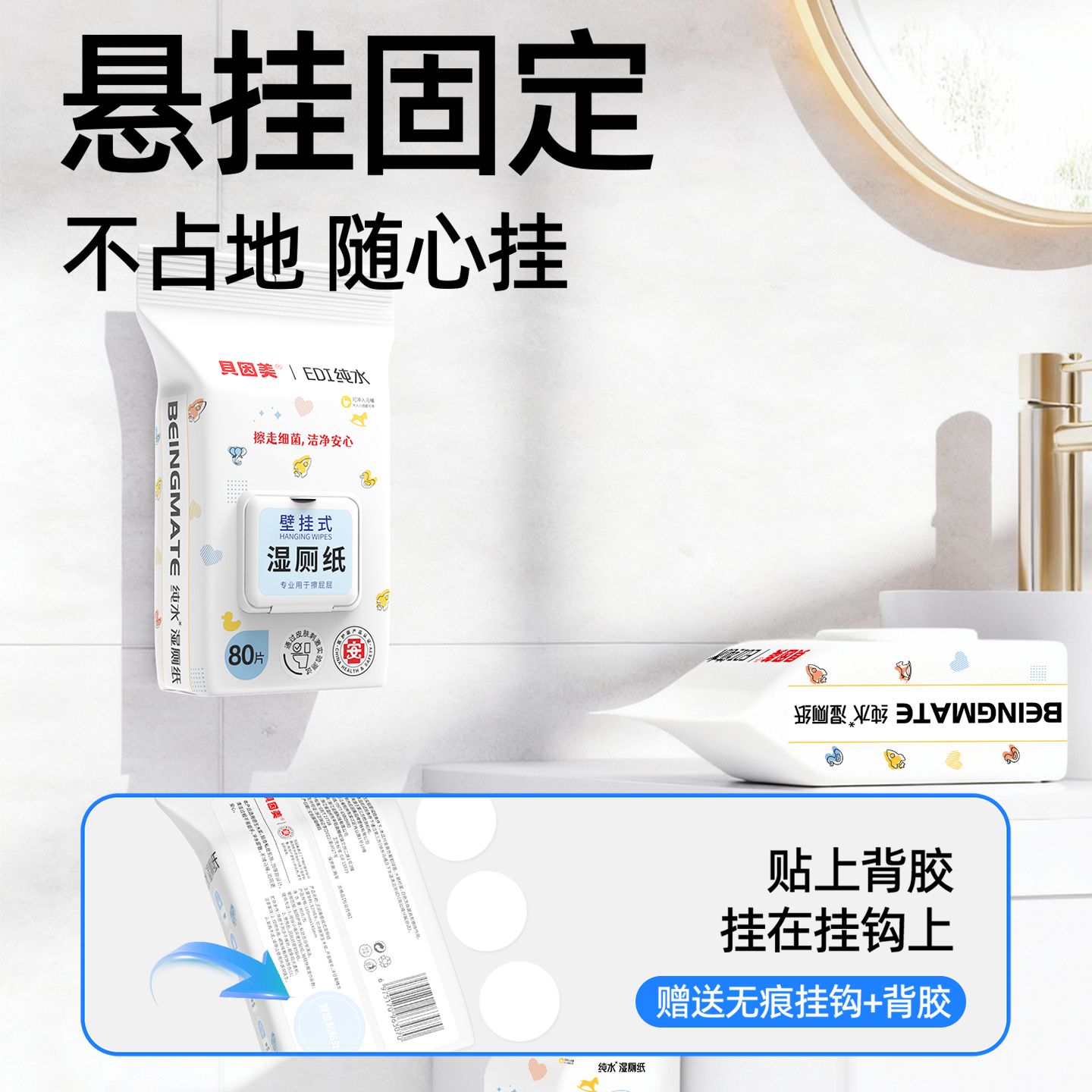 贝因美湿厕纸壁挂纯水速干无添加80抽家庭装姨妈期温和亲肤湿巾纸
