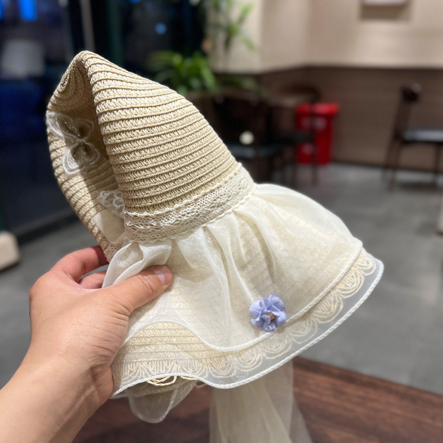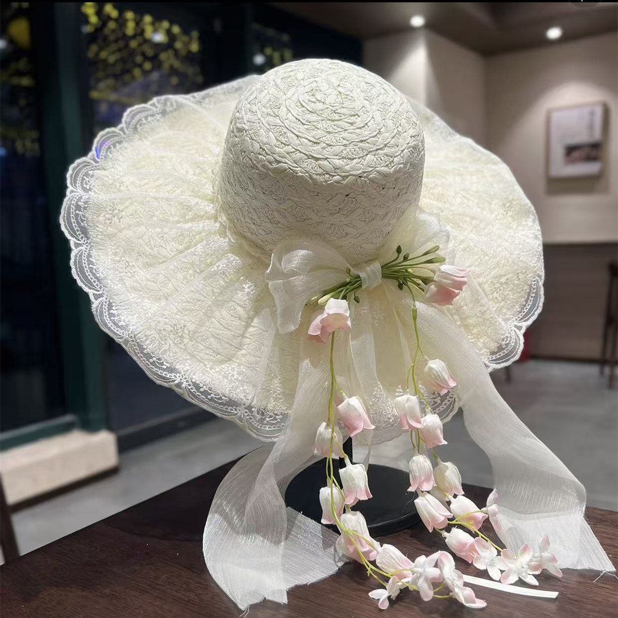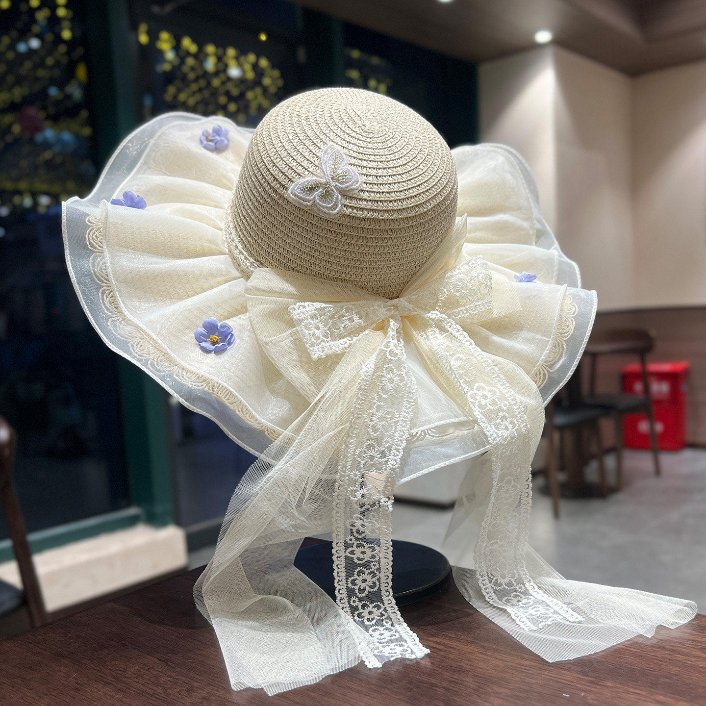 蕾丝大帽檐草帽女夏季海边沙滩遮阳防晒帽草编遮全脸防紫外线帽子