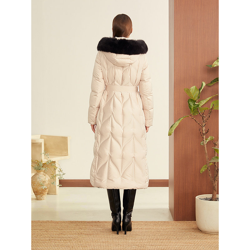 YINER音儿2025冬季新款法式柔光缎面撞色狐狸毛领连帽长款羽绒服