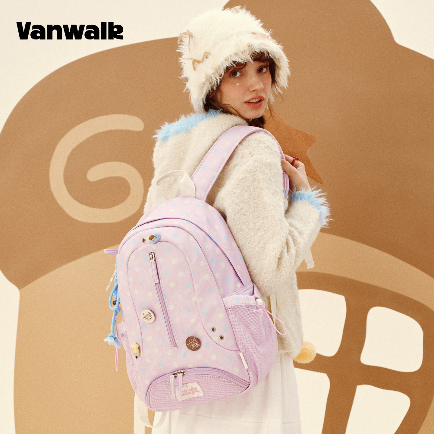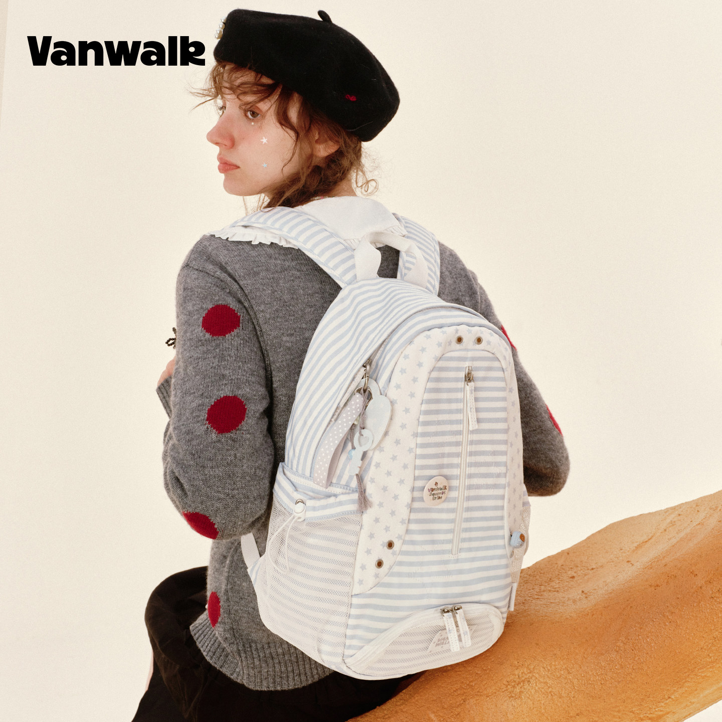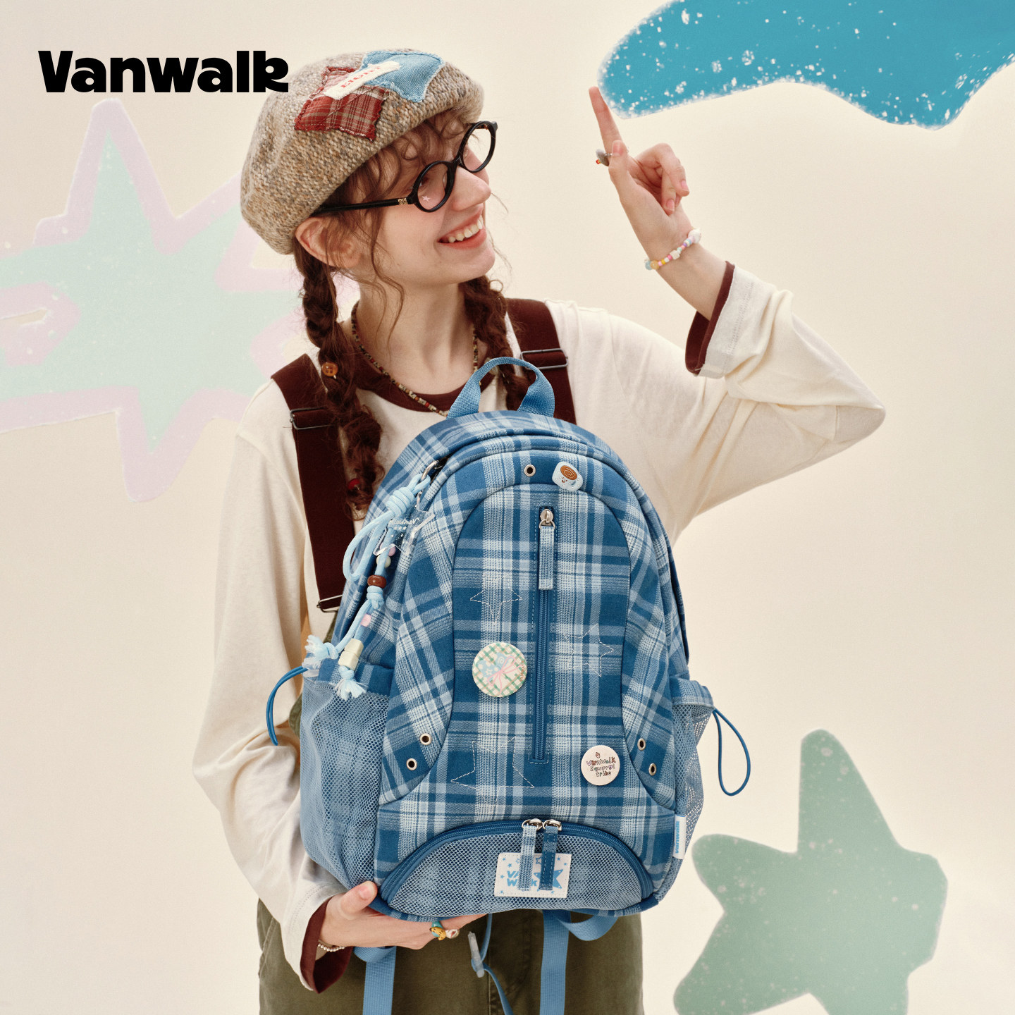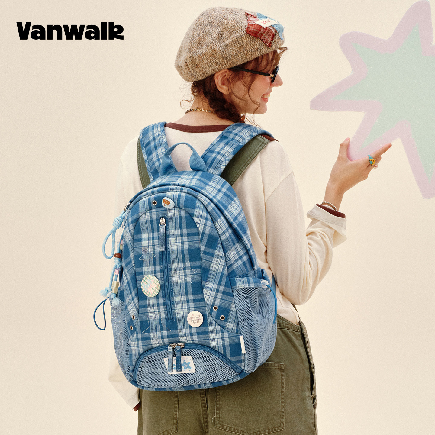 VANWALK松果部落 复古小众新款星星格纹旅行双肩包女休闲通勤书包