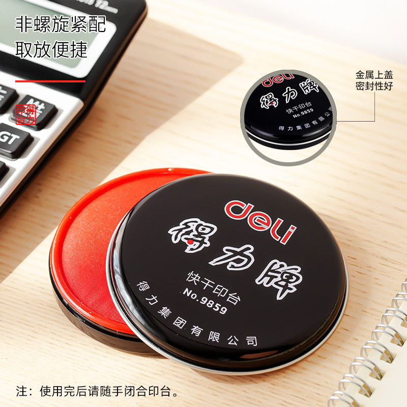得力红色快干印台印泥【油性】金属圆形铁盒配印油会计办公用品9859