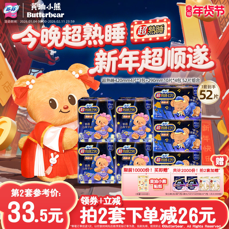 新国标卫生巾 苏菲超熟睡柔棉感超长夜用量大防漏组合 黄油小熊款