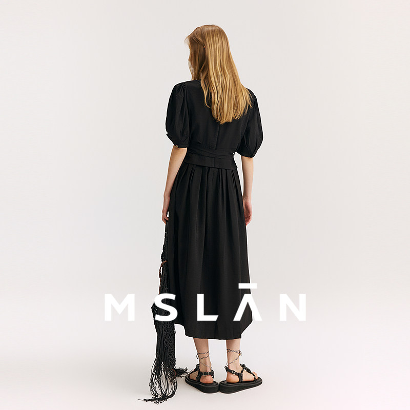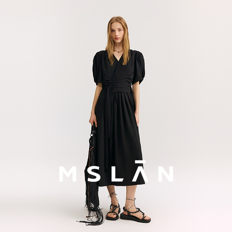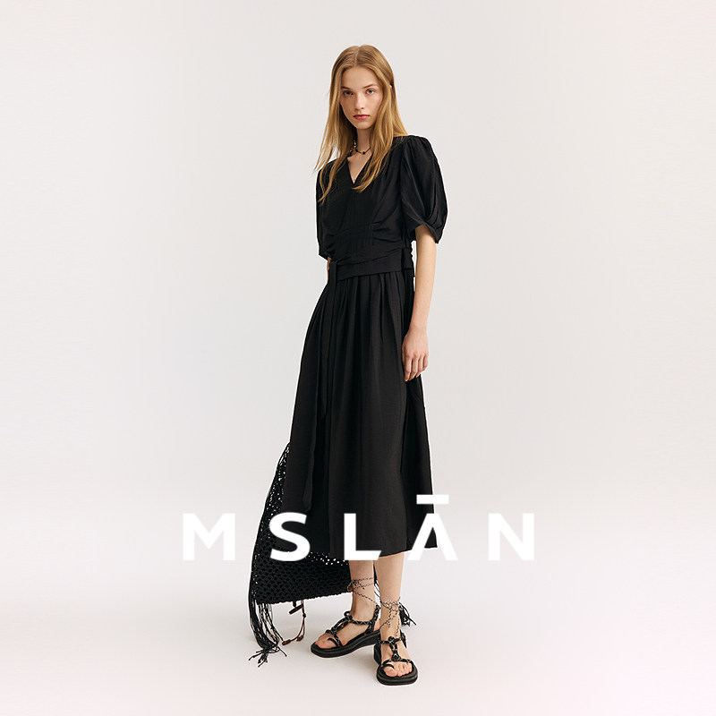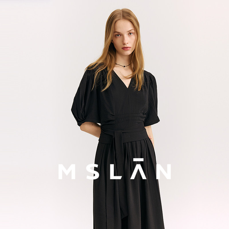 黑珍珠丨MSLAN夏季法式气质黑色连衣裙垂顺轻薄V领收腰长裙小黑裙