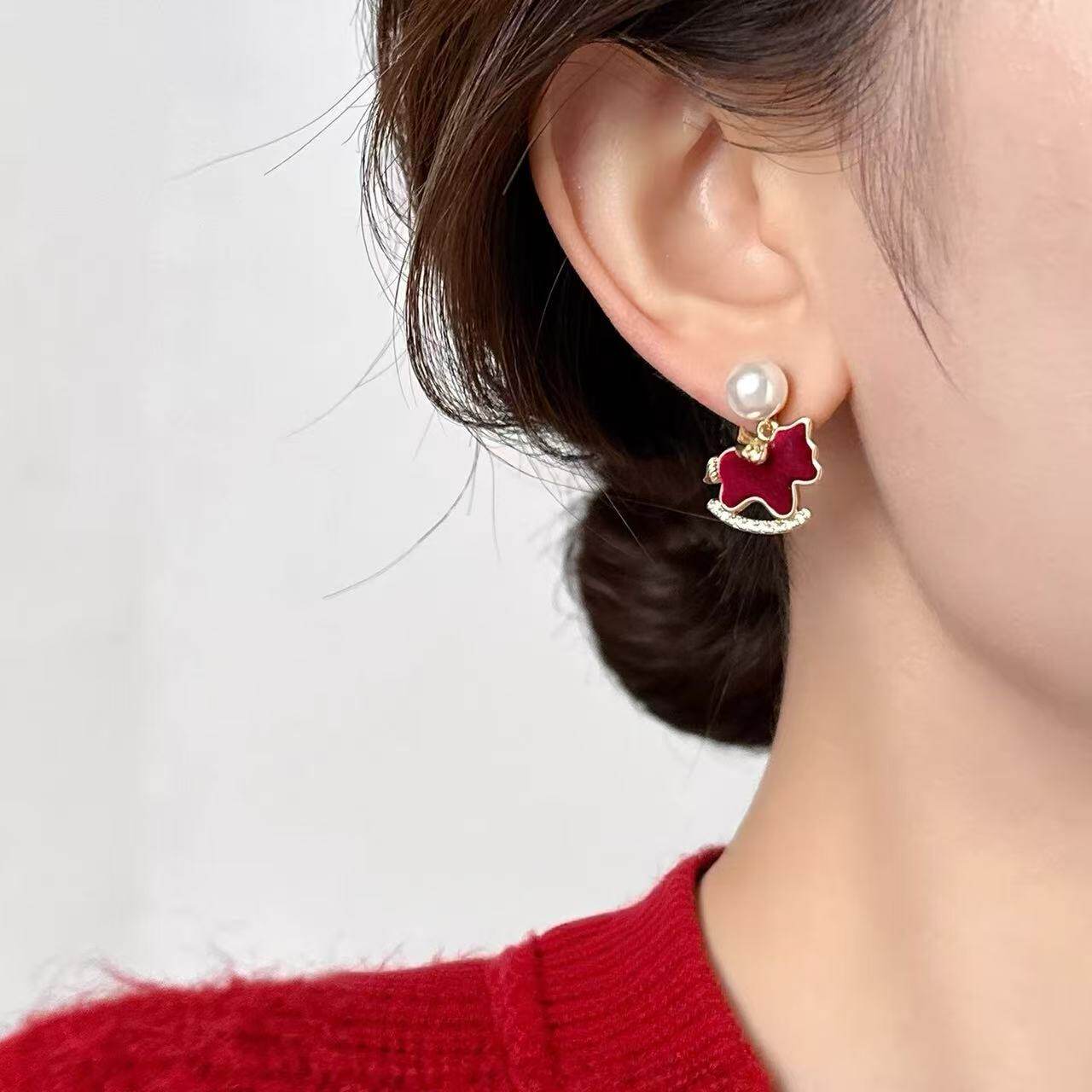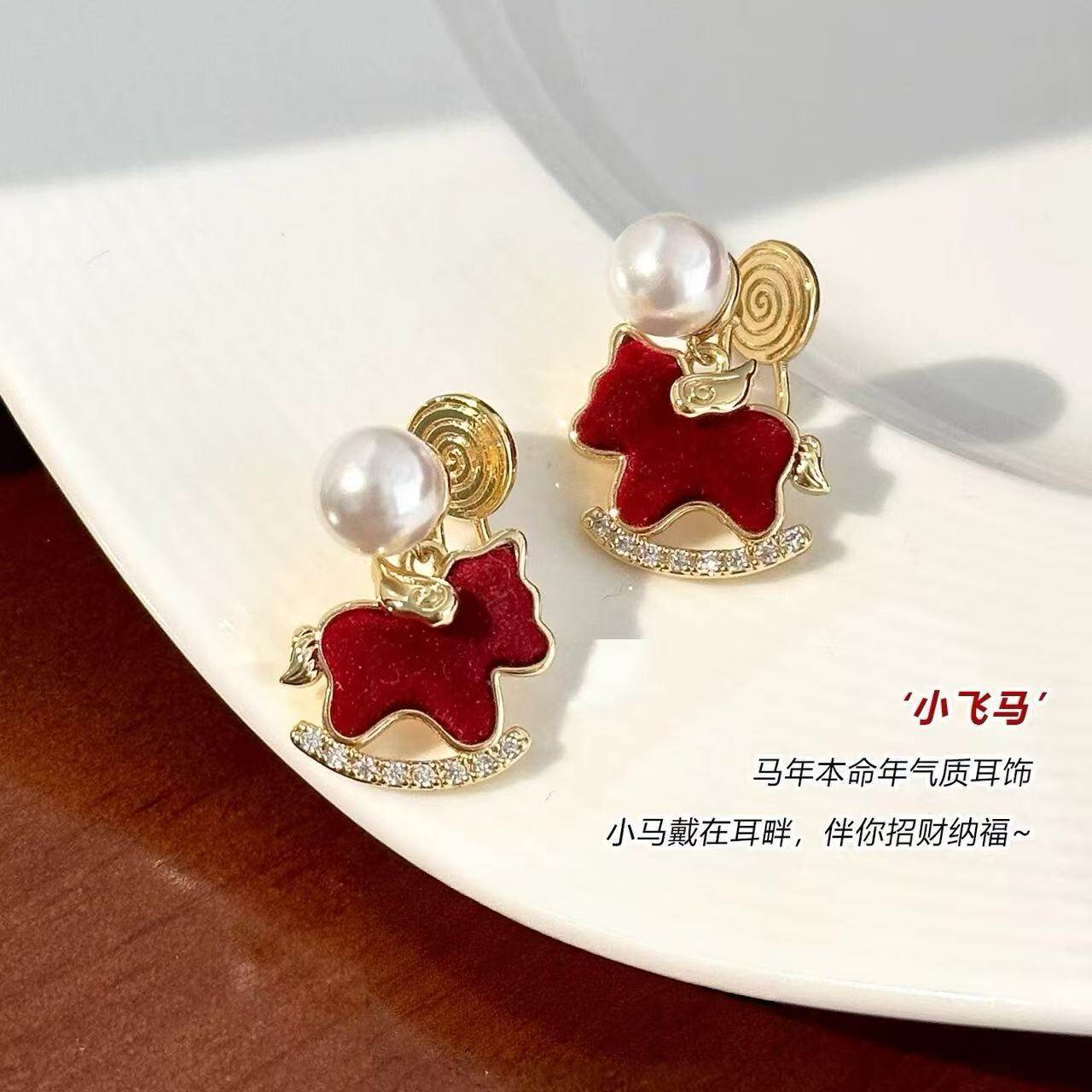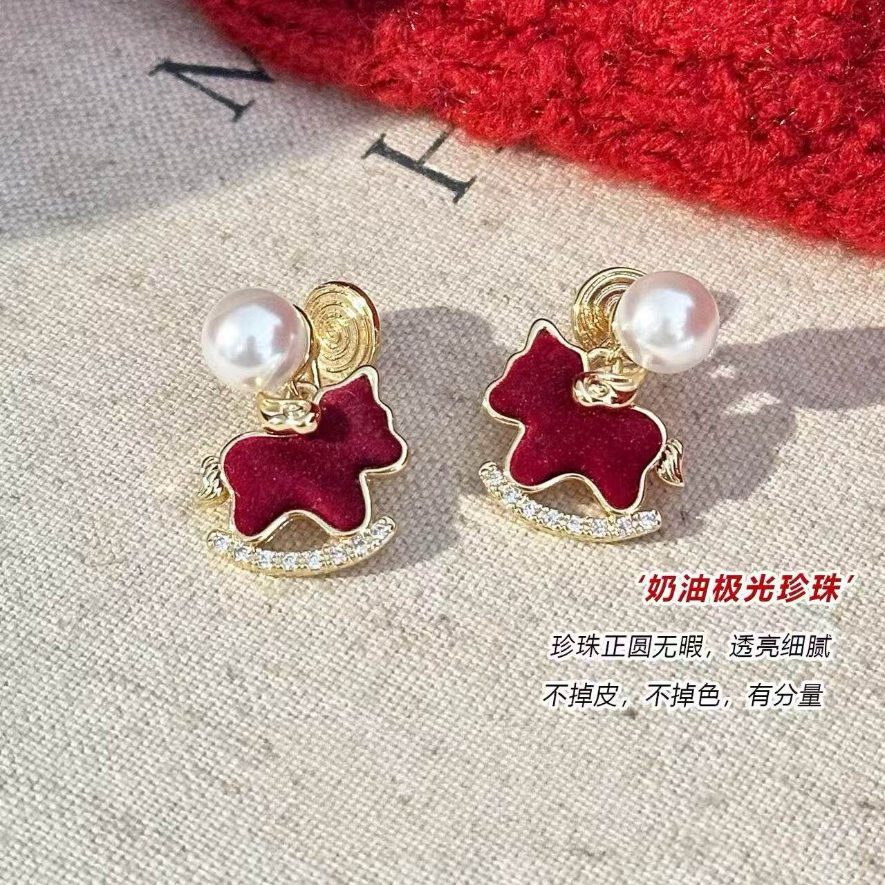 红色丝绒小马珍珠耳环女独特漂亮精致耳饰高档气质耳钉耳夹无耳洞