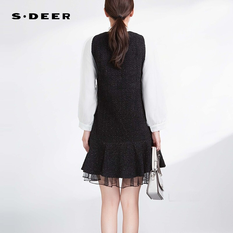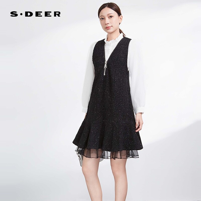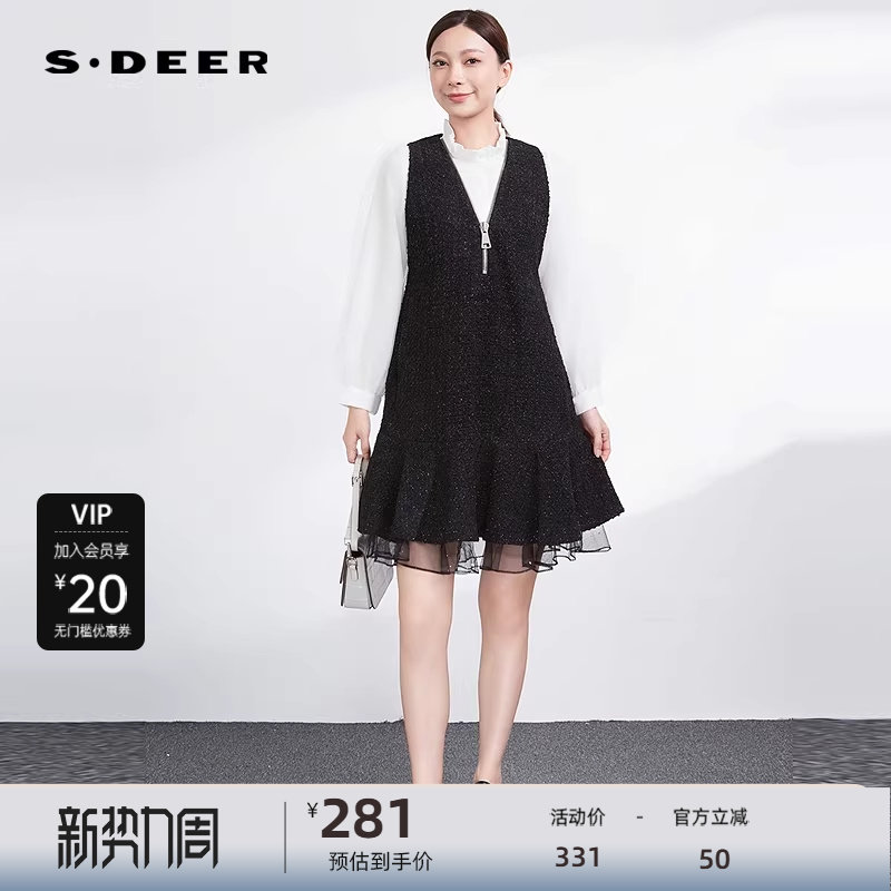 sdeer圣迪奥女装V领网纱拼接毛呢背带连衣裙S234Z12C5