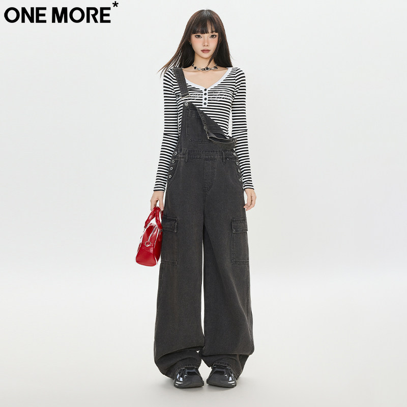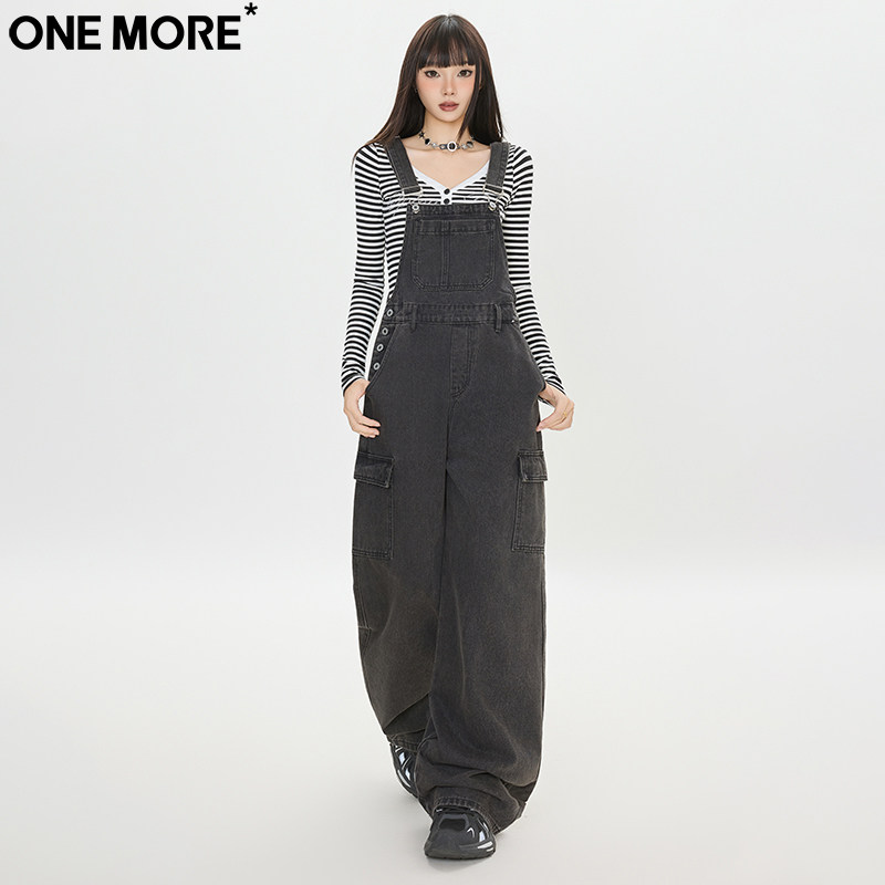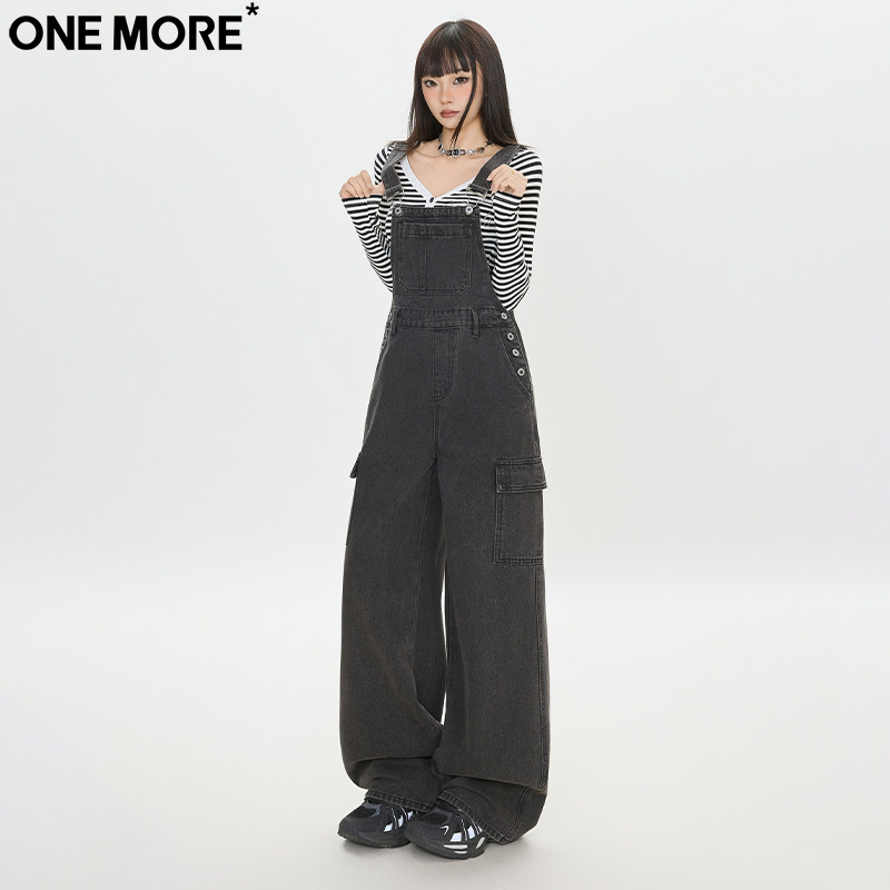 One More美式工装背带牛仔裤女秋季新款宽松直筒显瘦阔腿背带裤女
