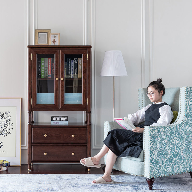 落地实木书柜中古风客厅书架展示柜带门手办柜玻璃柜小立柜组合柜