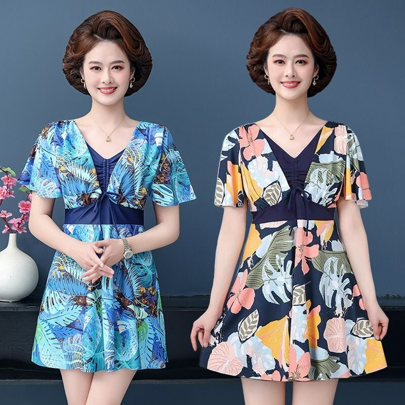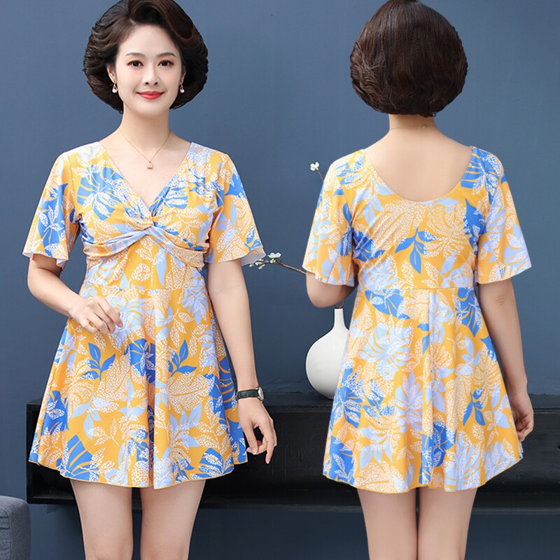 妈妈泳衣中老年女保守两件套分体中年游泳衣大码遮肚显瘦温泉泳装