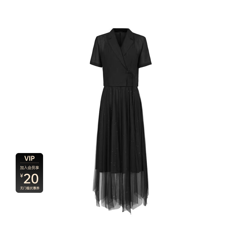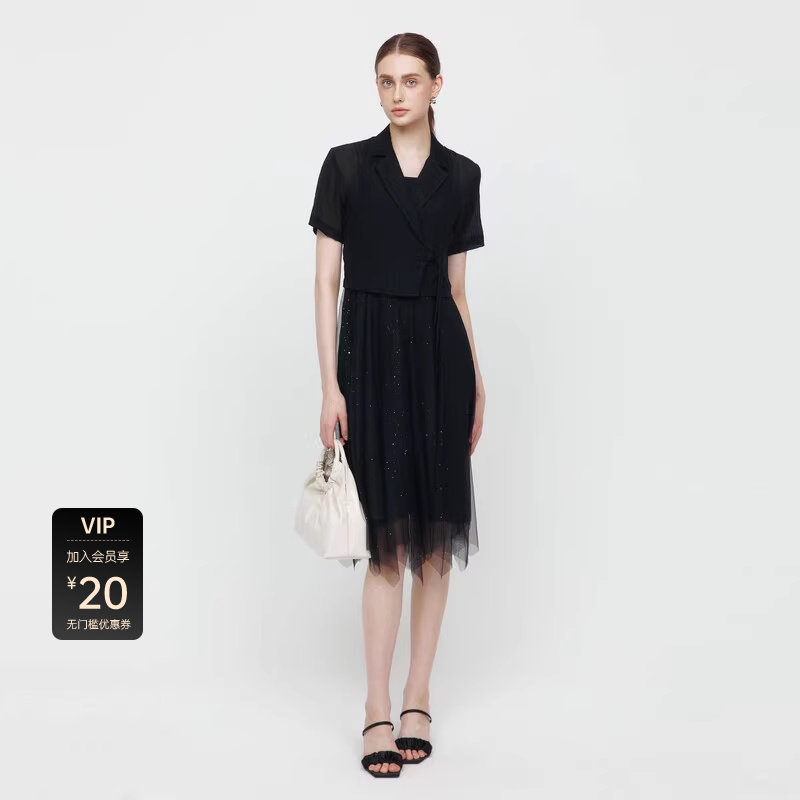 sdeer圣迪奥女装优雅西装领盘扣网纱连衣裙套装S24261410