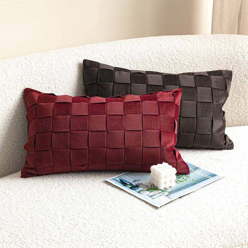 轻奢复古丝绒编织抱枕红色绿色沙发腰枕样板间靠枕长方形软装搭配