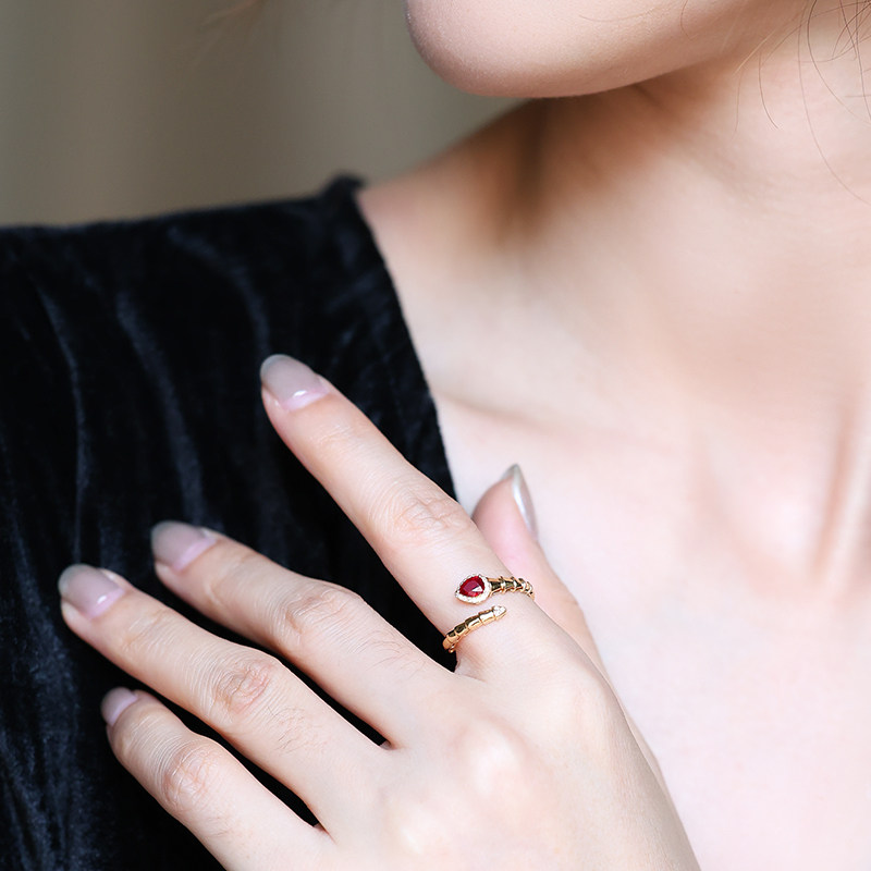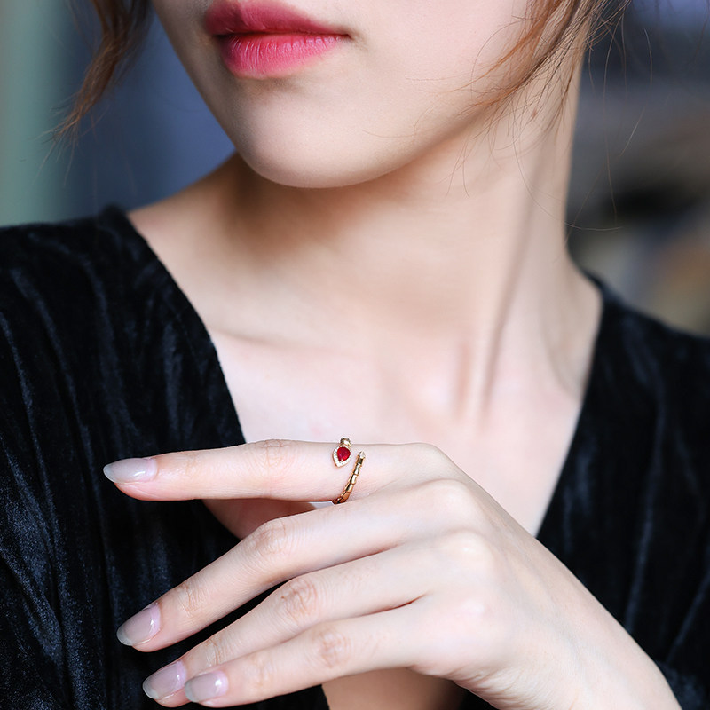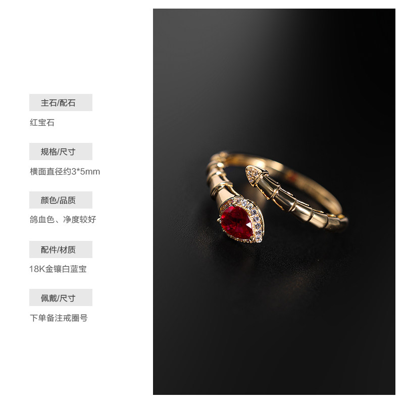若华珠宝腾蛇=天然鸽血红宝石戒指女18K金彩宝尾戒开口戒礼物定制