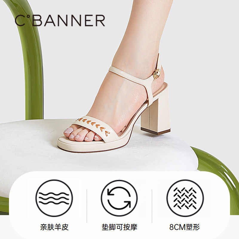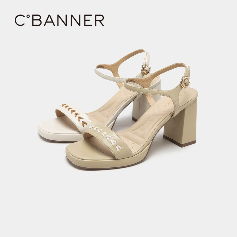 千百度女款夏季新款时装凉鞋一字带法式超高跟鞋粗跟配裙子