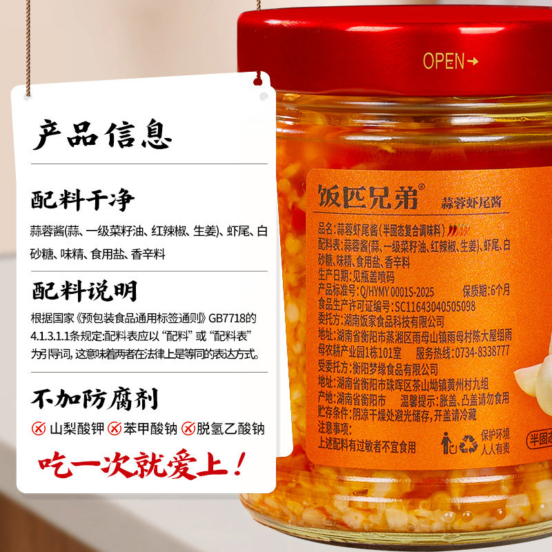 饭匹兄弟蒜蓉虾尾酱香辣小龙虾拌面酱湖南特产辣椒酱下饭菜拌饭酱