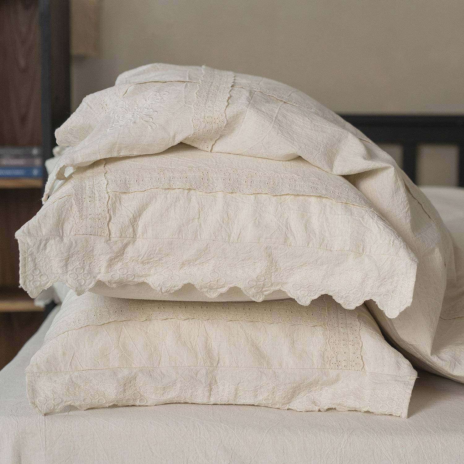 日系文艺复古简约纯色优雅枫丹白露棉麻肌理刺绣花边棉麻四件套