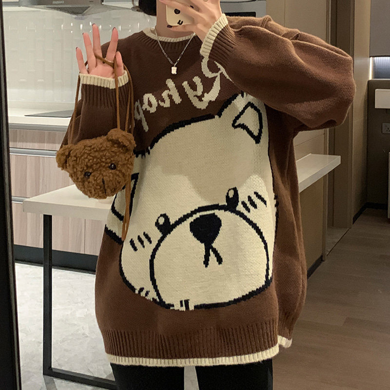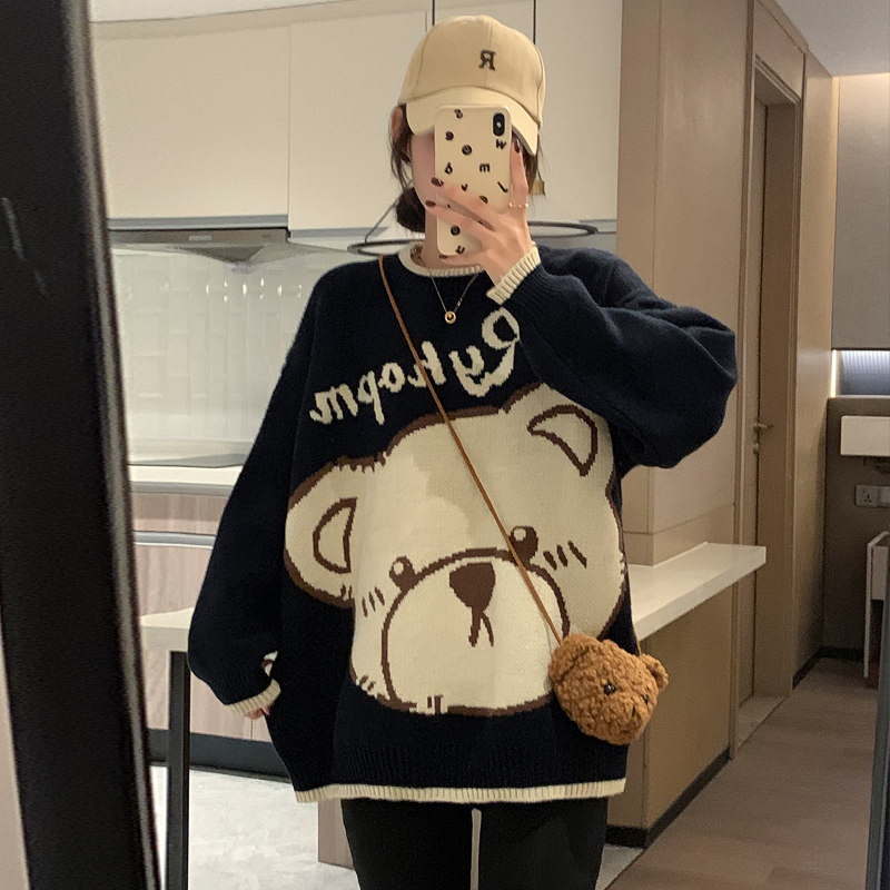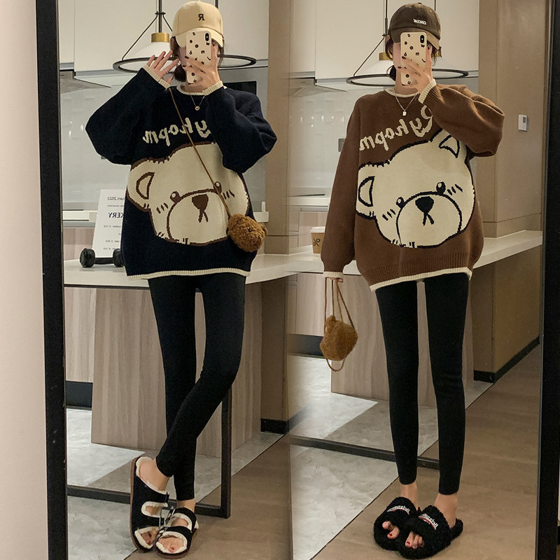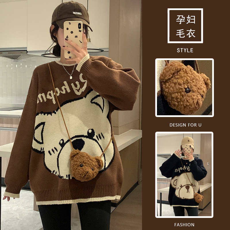 孕妇装秋冬套装2024新款大码遮肚子宽松显瘦卡通熊毛衣两件套秋季