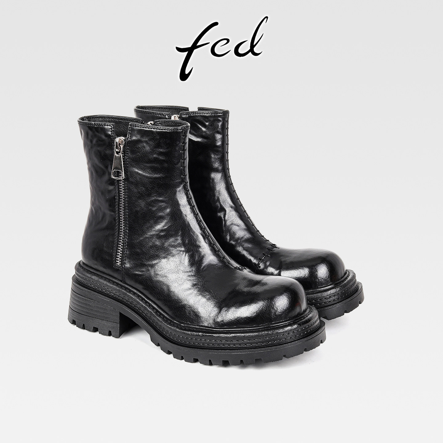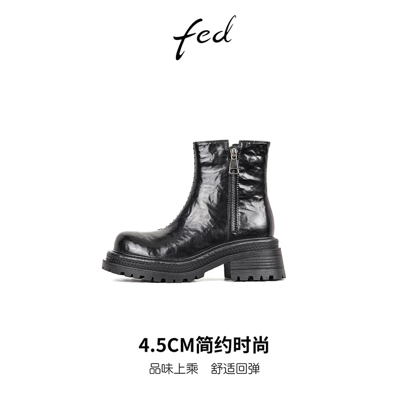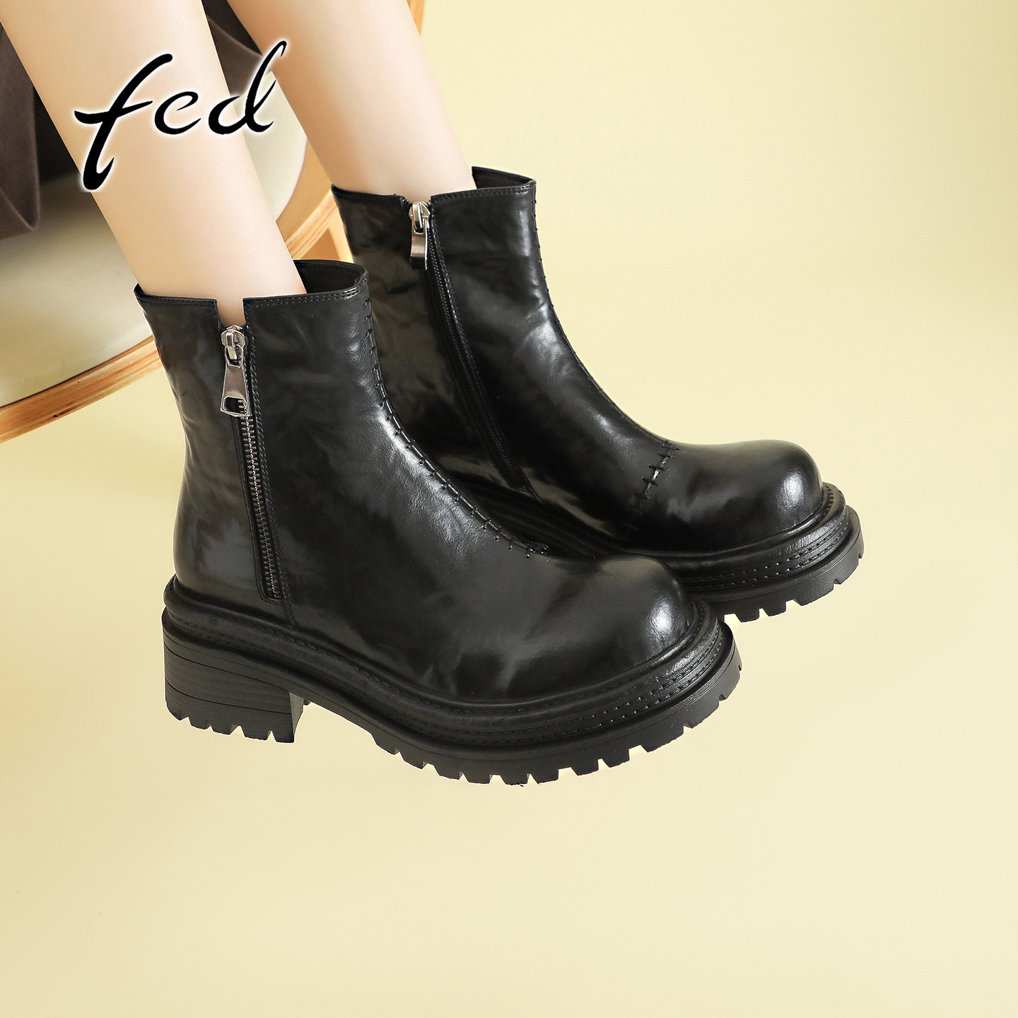 fed英伦风复古真皮粗跟厚底马丁靴女秋冬新款侧拉链中跟圆头短靴