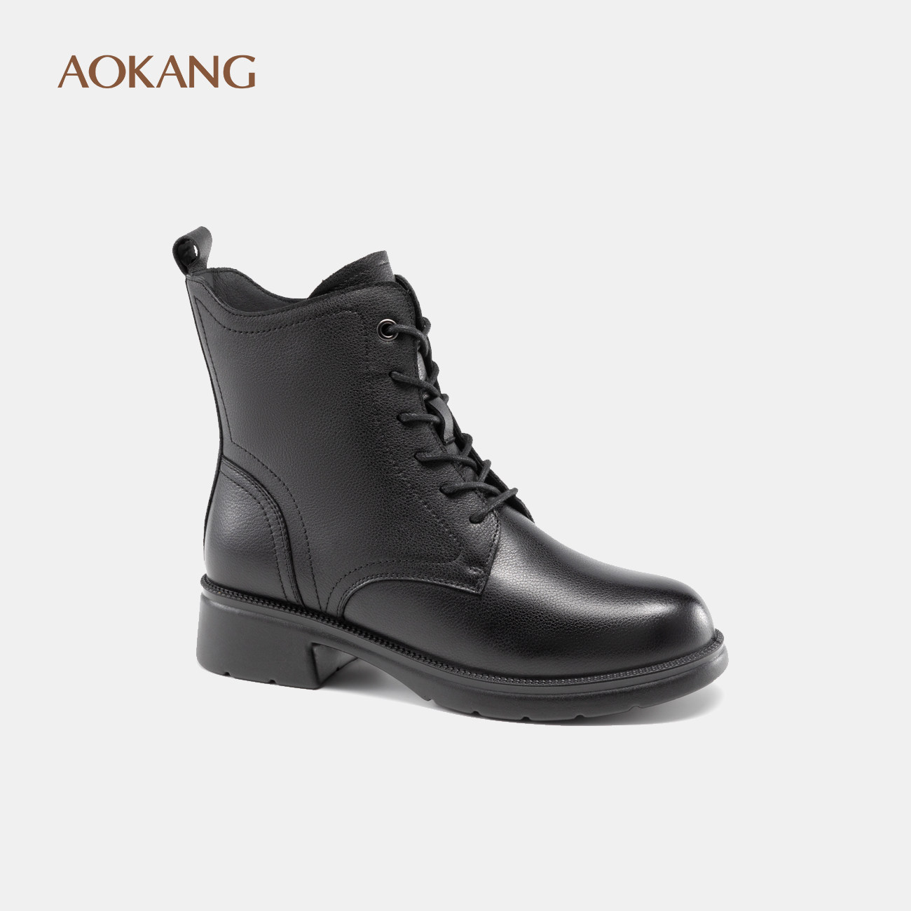 奥康女鞋冬季真皮系带马丁靴加绒保暖舒适英伦风经典短靴