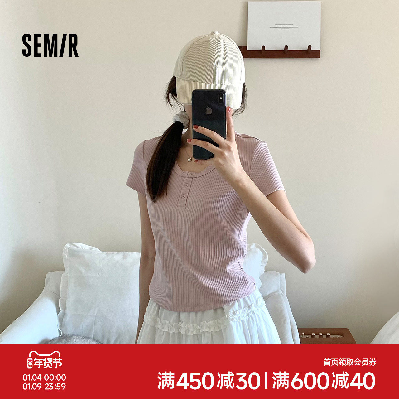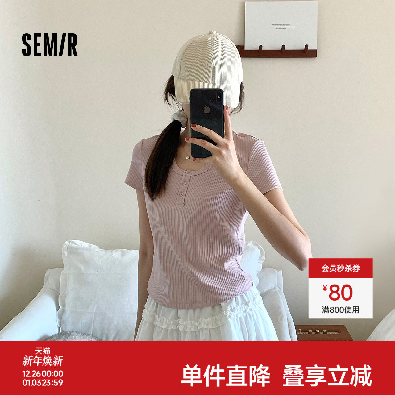森马短袖T恤女短款小性感亨利领气质2025夏新款纯色修身上衣百搭