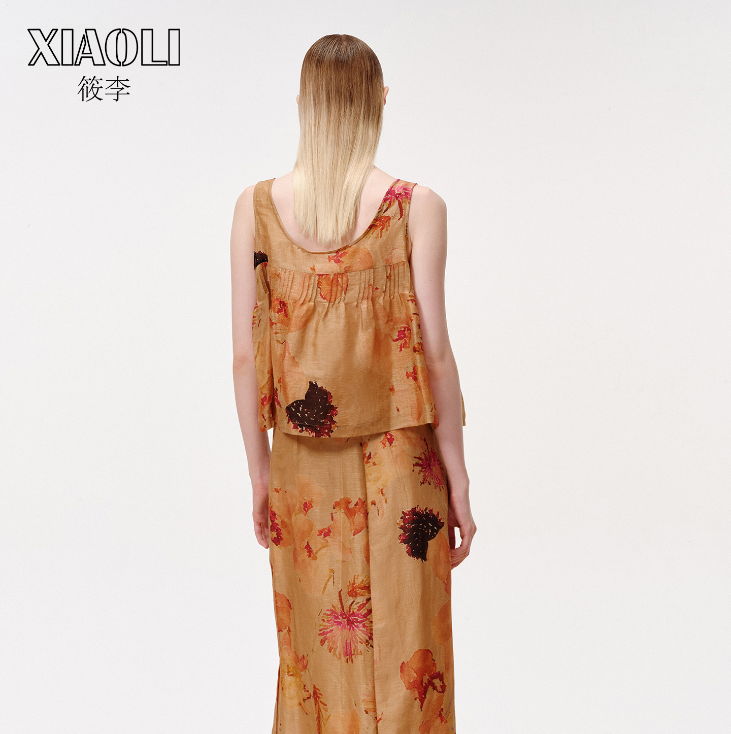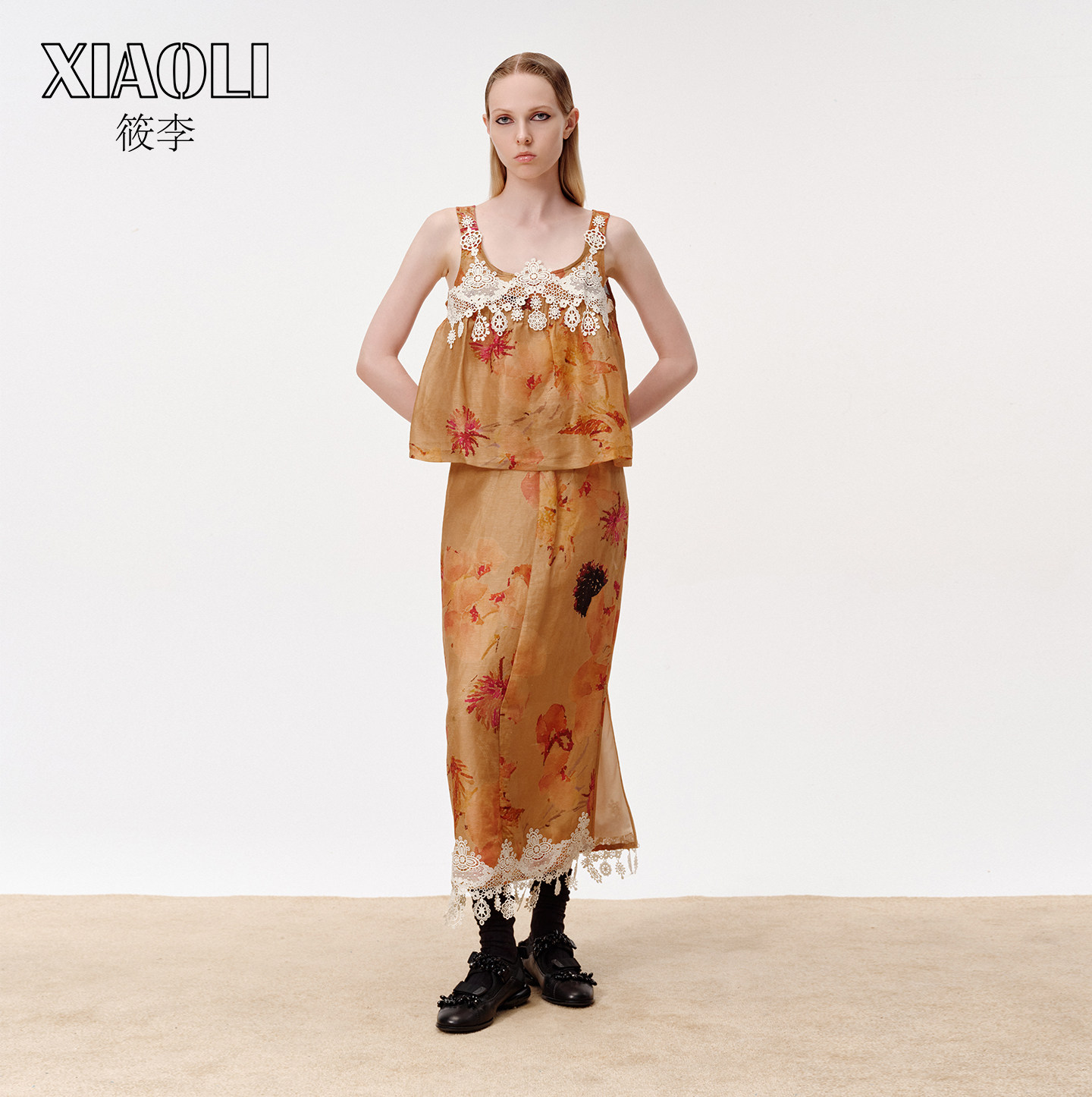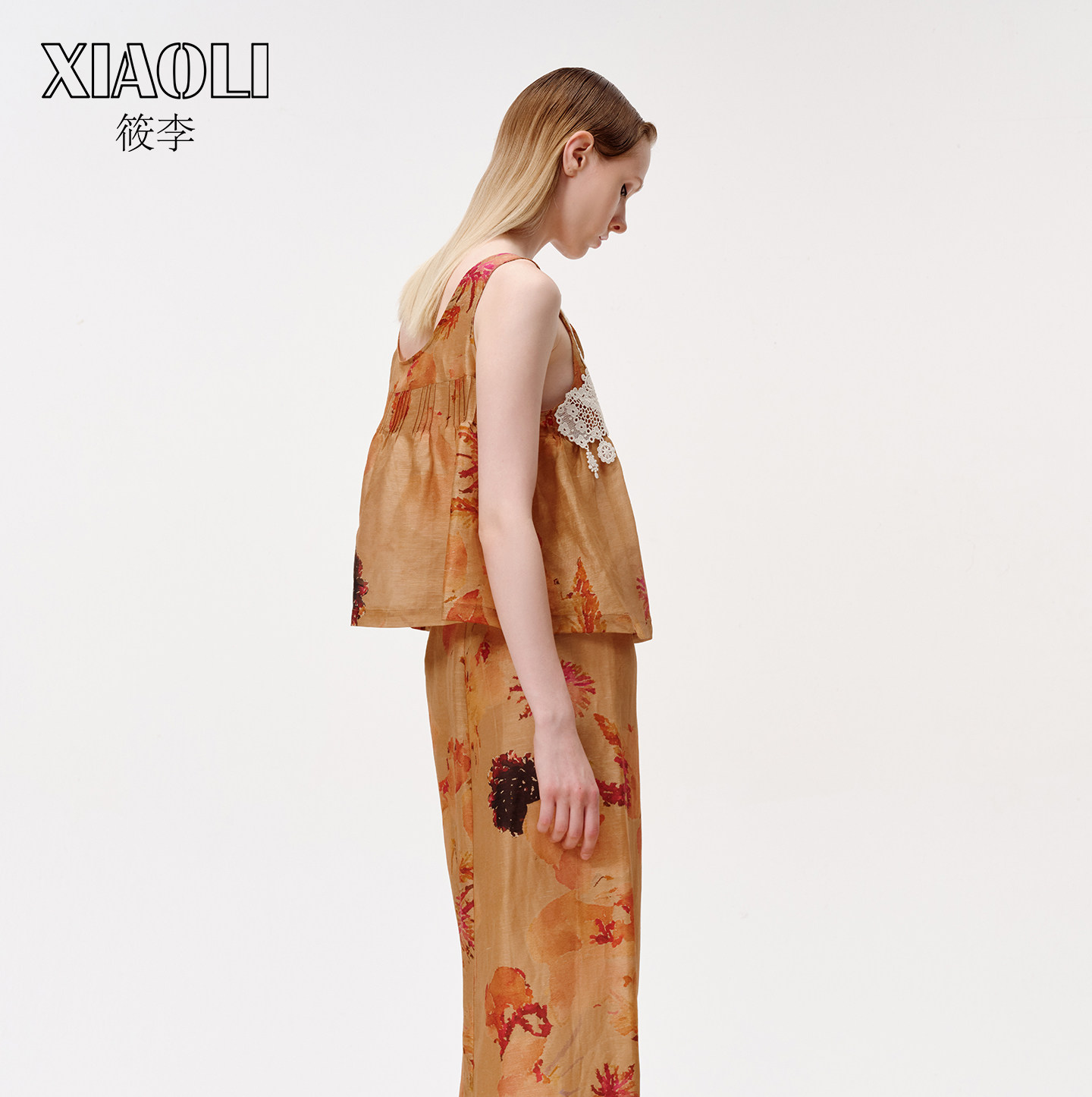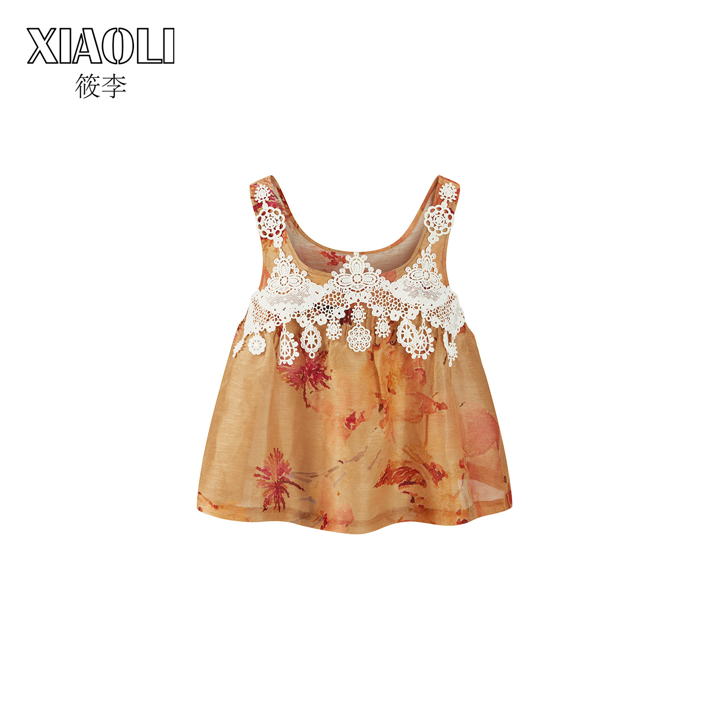 【XIAOLI筱李】度假风花卉印花卡其色印花蕾丝背心上衣25秋新品