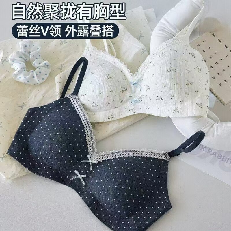 「YED多碎花无痕内衣少女小胸蕾丝V领果冻胶软文胸」波点钢圈聚拢