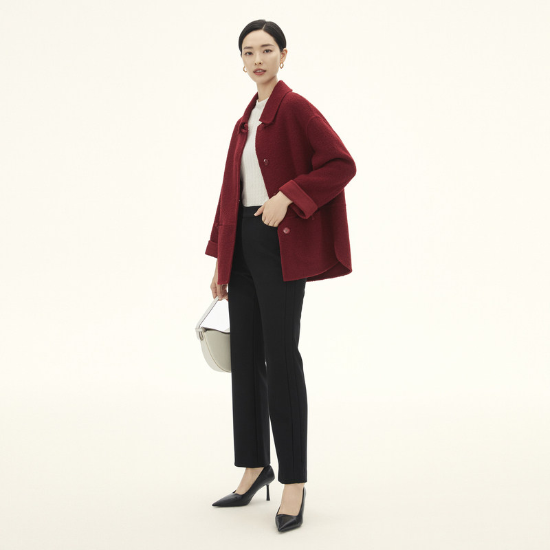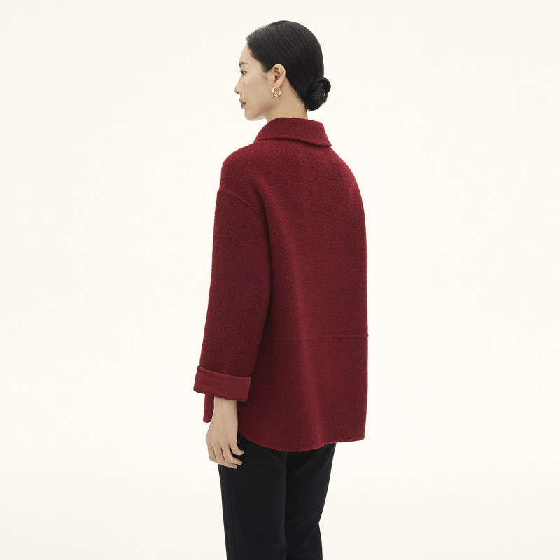 水沐飞高级感酒红色双面羊绒大翻领毛呢大衣女秋冬中长款羊毛外套