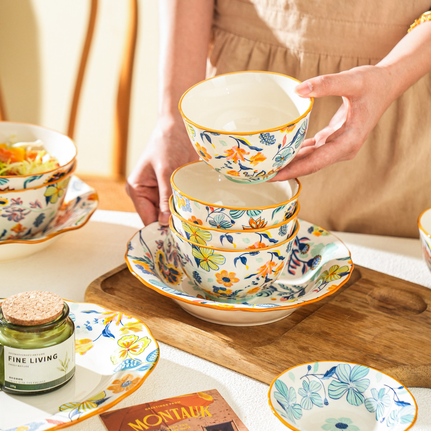 奶油风陶瓷碗家用卡通菜盘子可爱米饭碗汤碗釉下彩儿童餐具耐高温