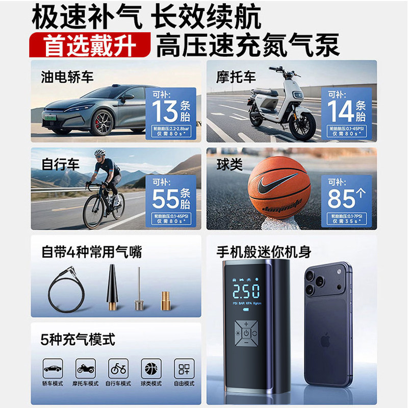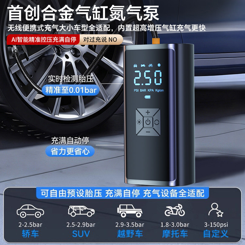 车载充气泵便携式汽车用电动打气筒氮气轮胎带测胎压小型自动加气
