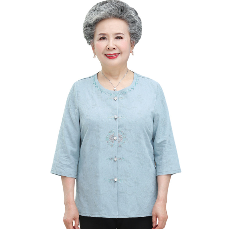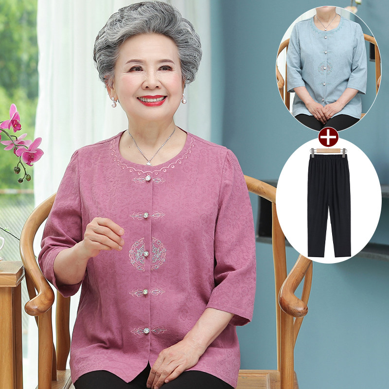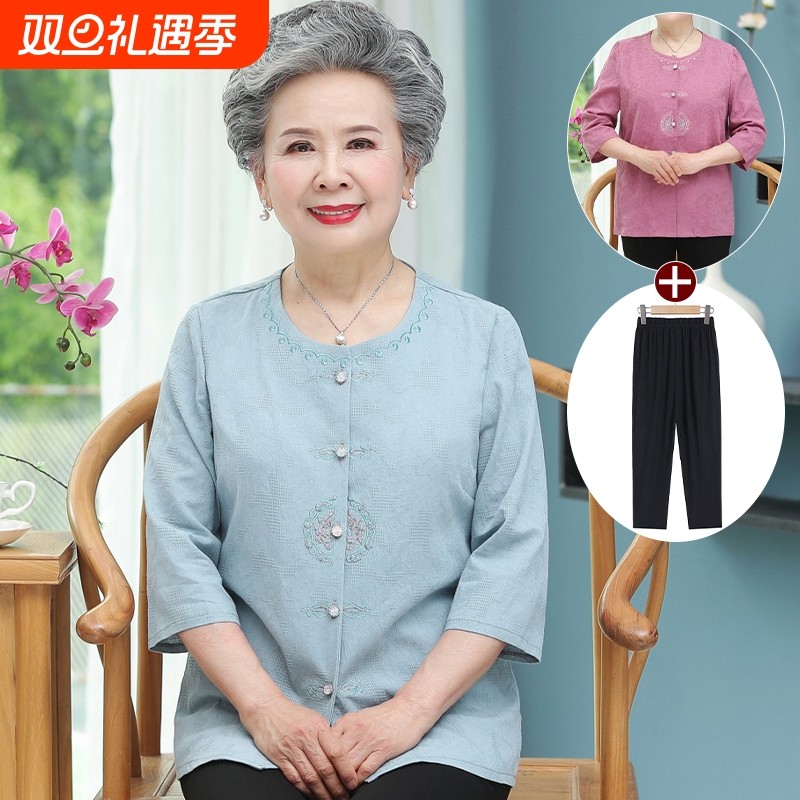 中老年人夏装女奶奶全棉衬衫60岁70老人衣服棉麻上衣妈妈套装薄款