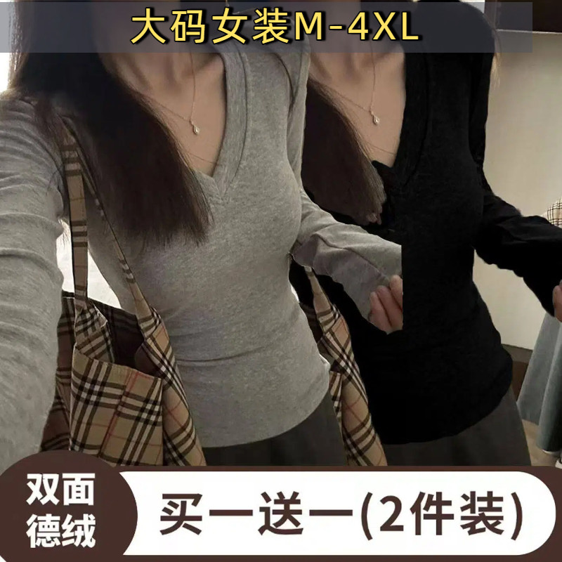 德绒V领长袖打底衫内搭秋冬女修身显瘦辣妹正肩保暖加绒上衣t恤潮