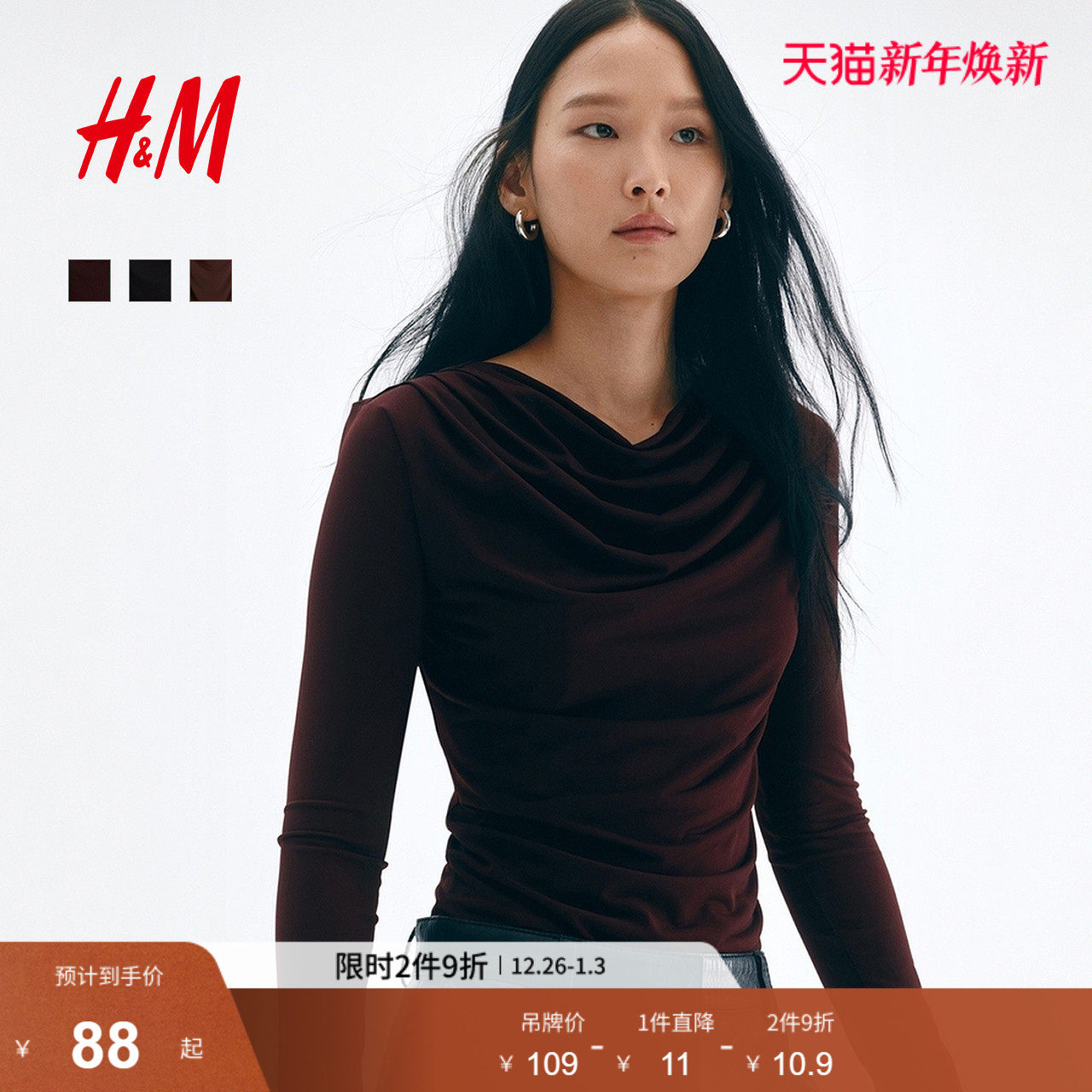 HM女装T恤2025年冬季新款长袖法式气质时尚休闲荡领上衣1301327