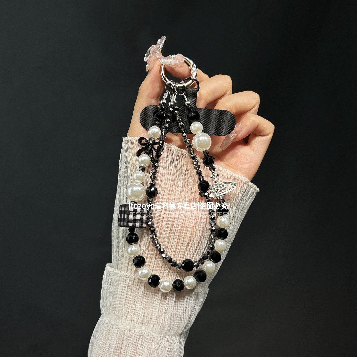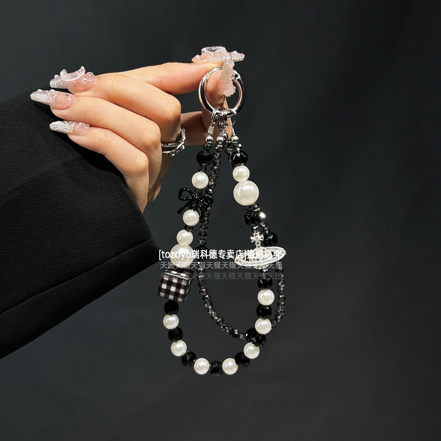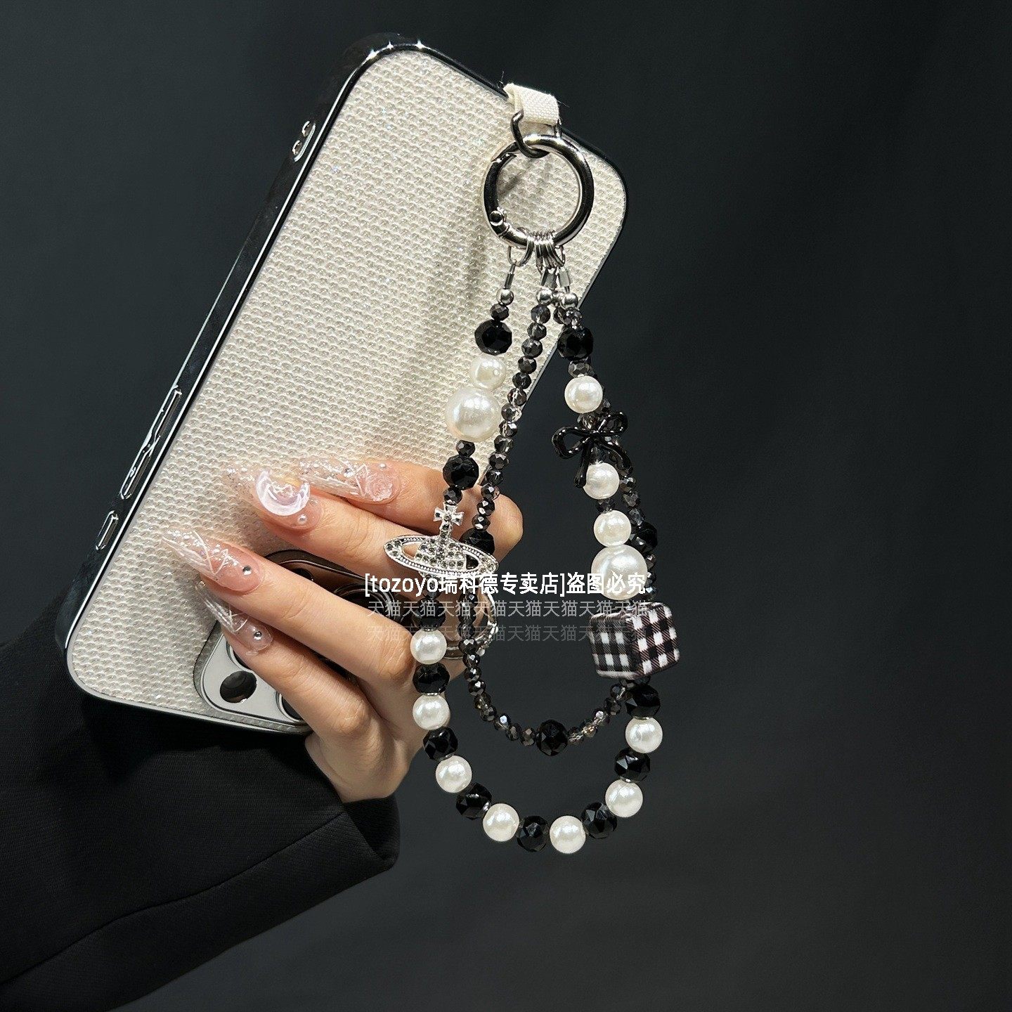 黑白手机链镶钻土星大牌挂链珍珠黑水晶双链条简约漂亮小众串珠手腕挂件手链轻奢高级感腕带挂链新款女夹片壳