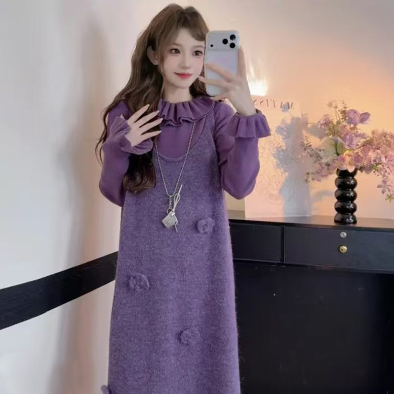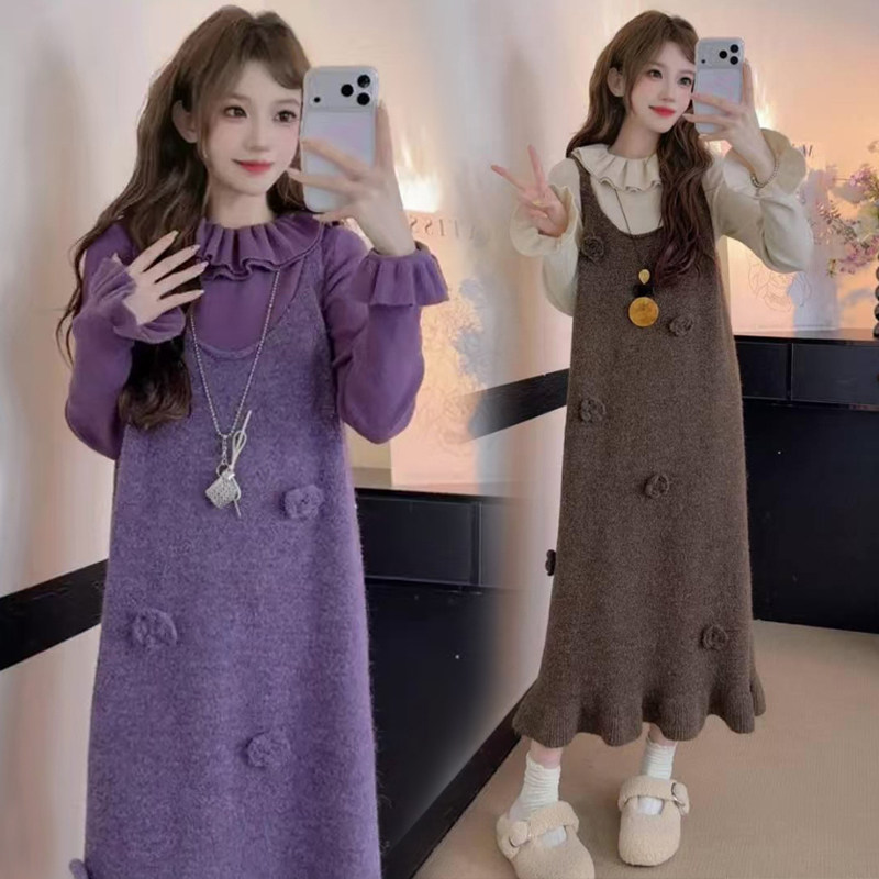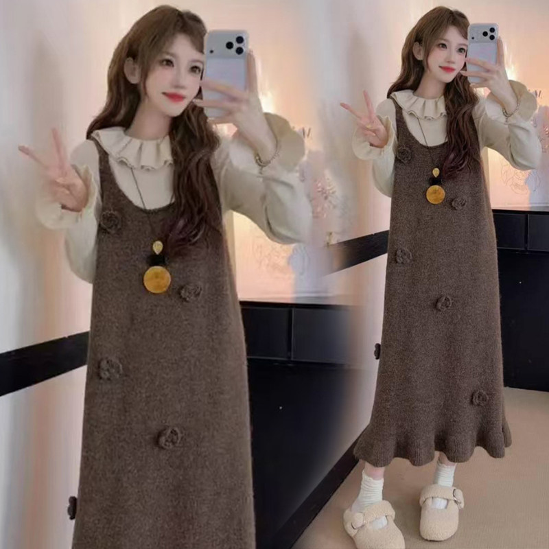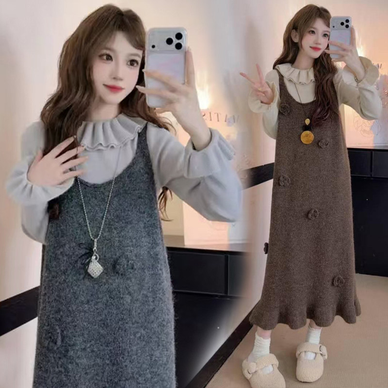孕妇连衣裙秋冬新款重工编织毛衣背心连衣裙女长款鱼尾摆温柔风