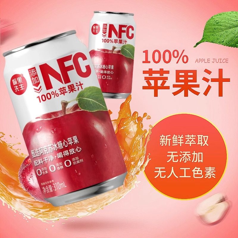 NFC100%苹果汁饮料0添加非浓缩纯果汁酸甜0脂肪果汁310ml*8罐整箱