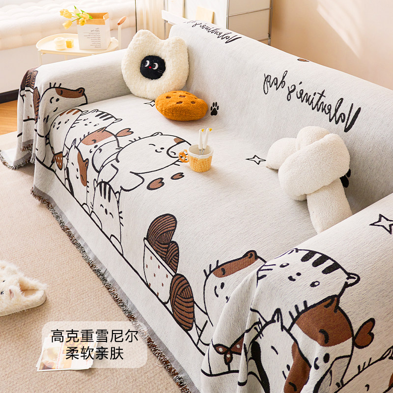 卡通沙发巾雪尼尔防猫抓沙发全盖布四季通用沙发套罩沙发毯高级感