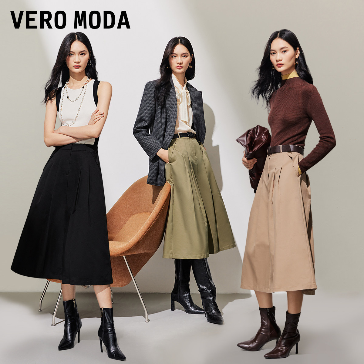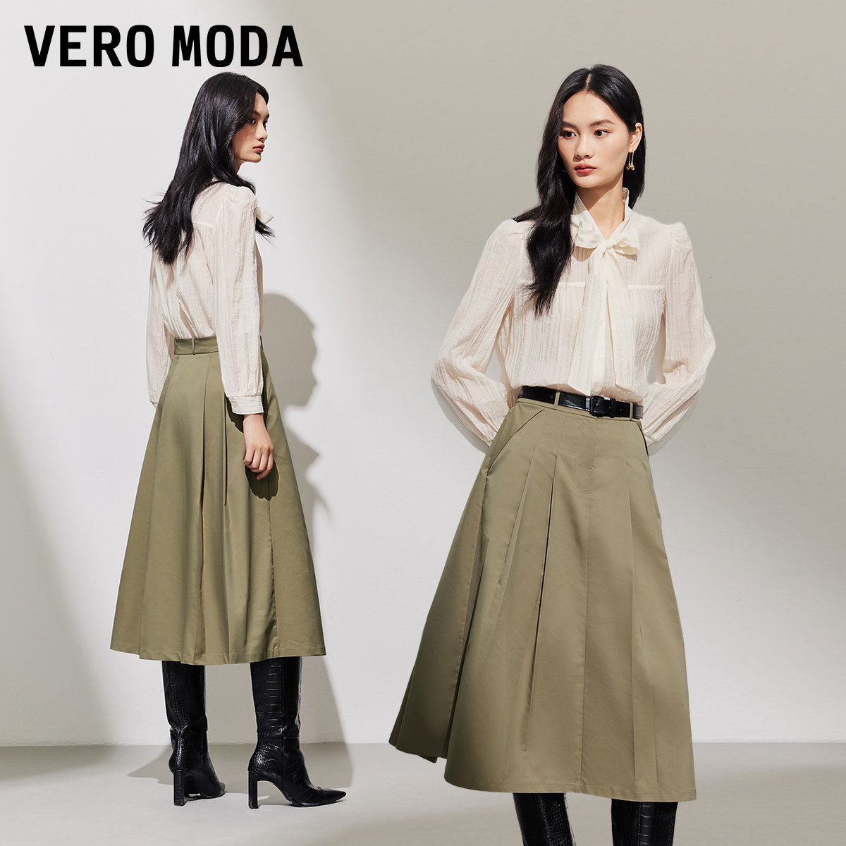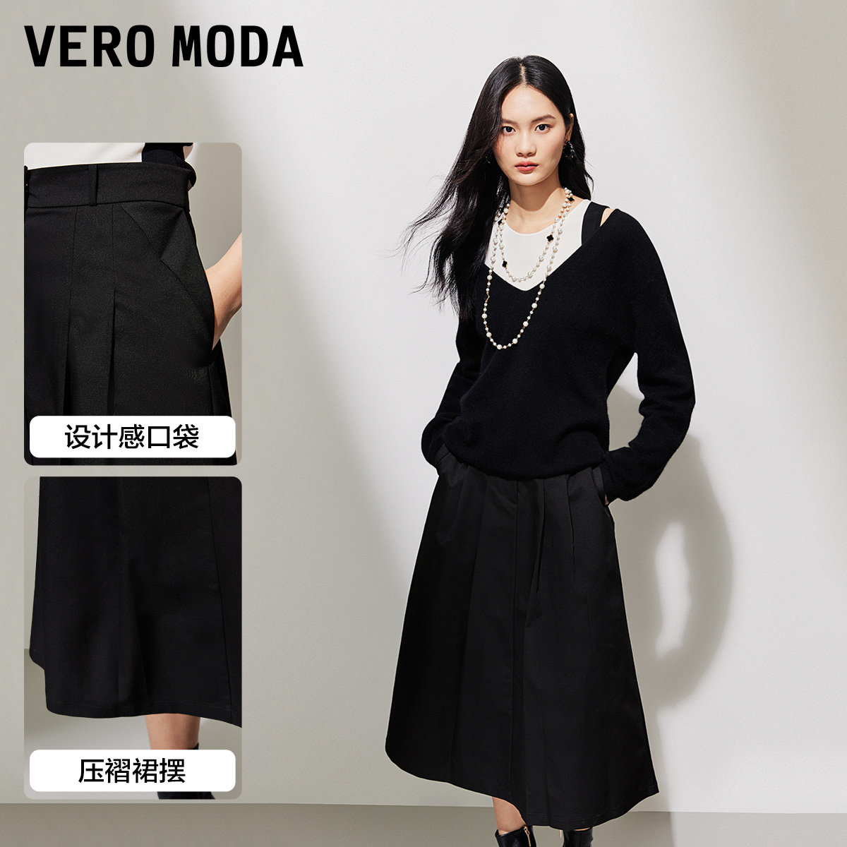 Vero Moda奥莱半身裙子秋季新款褶皱A摆中长裙简约气质优雅流行