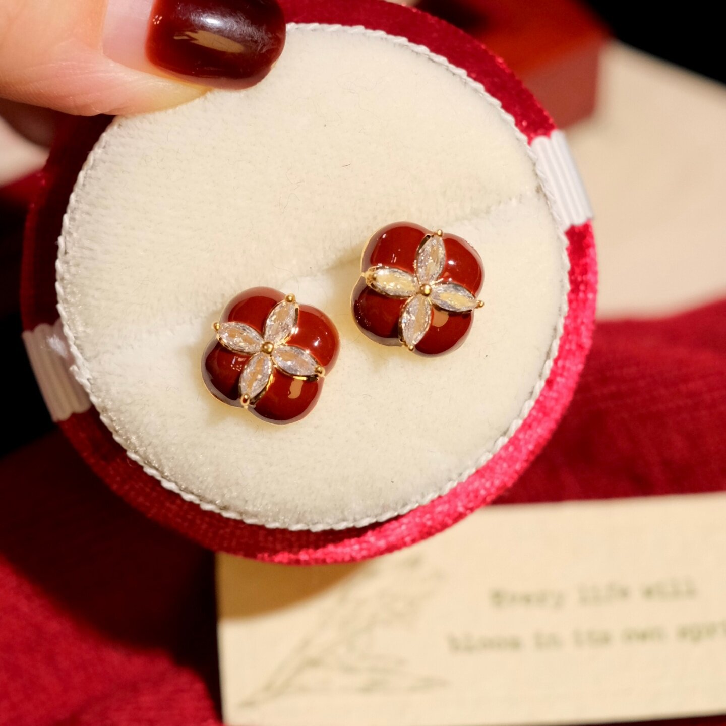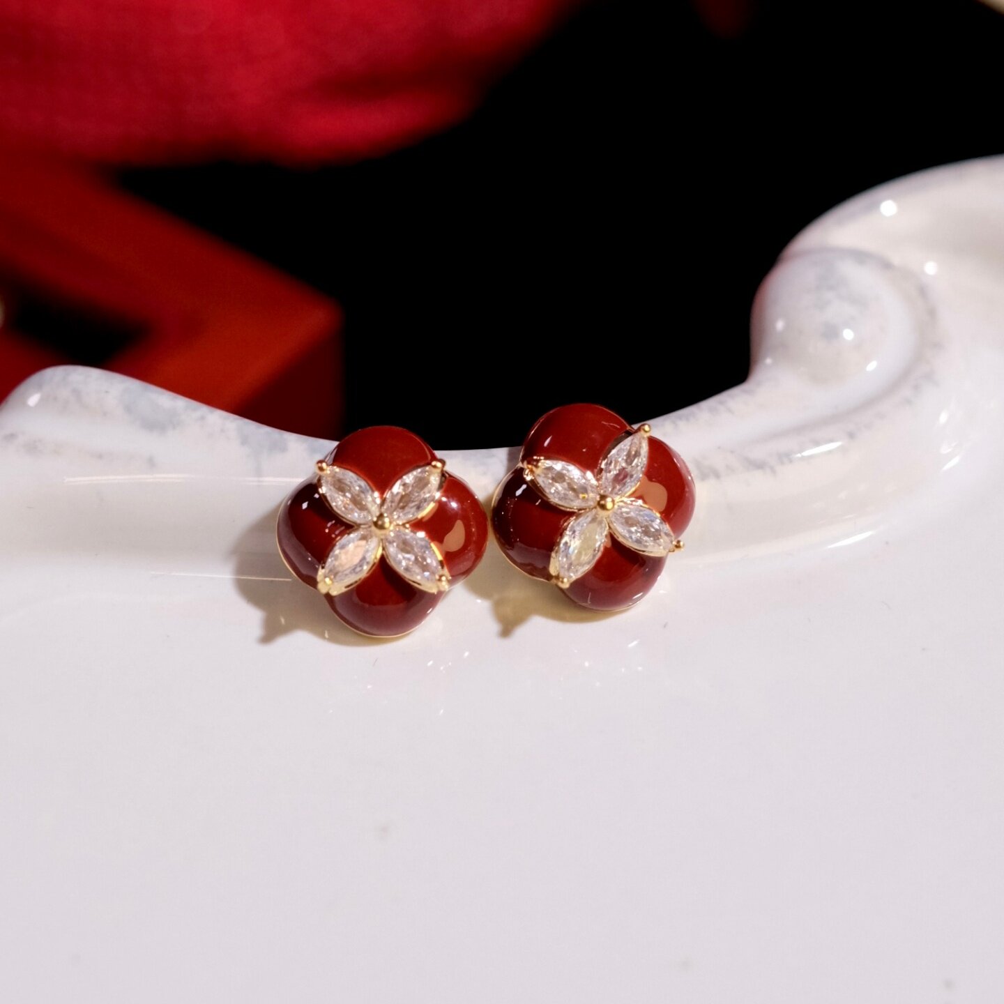 《浆果星芒》秋冬精致复古显白酒红色四叶草锆石耳钉耳环耳饰耳夹