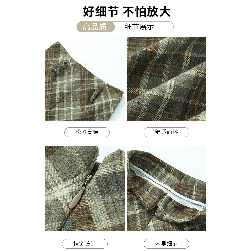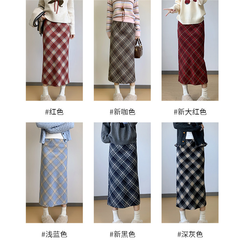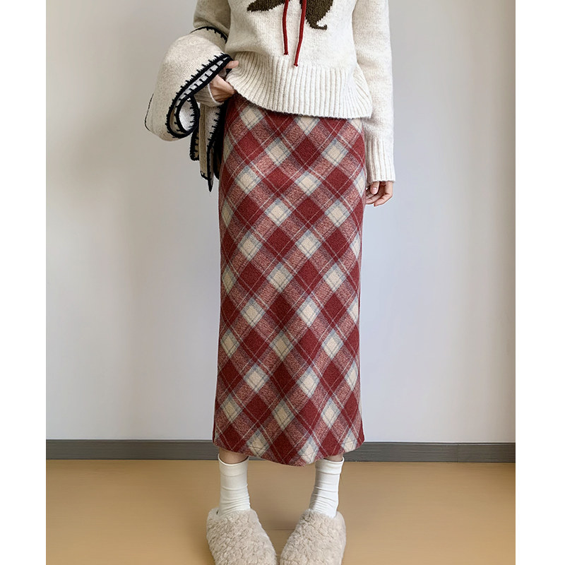 NOME(服饰)红色复古毛呢格子半身裙女高腰开叉秋冬加绒包臀长裙
