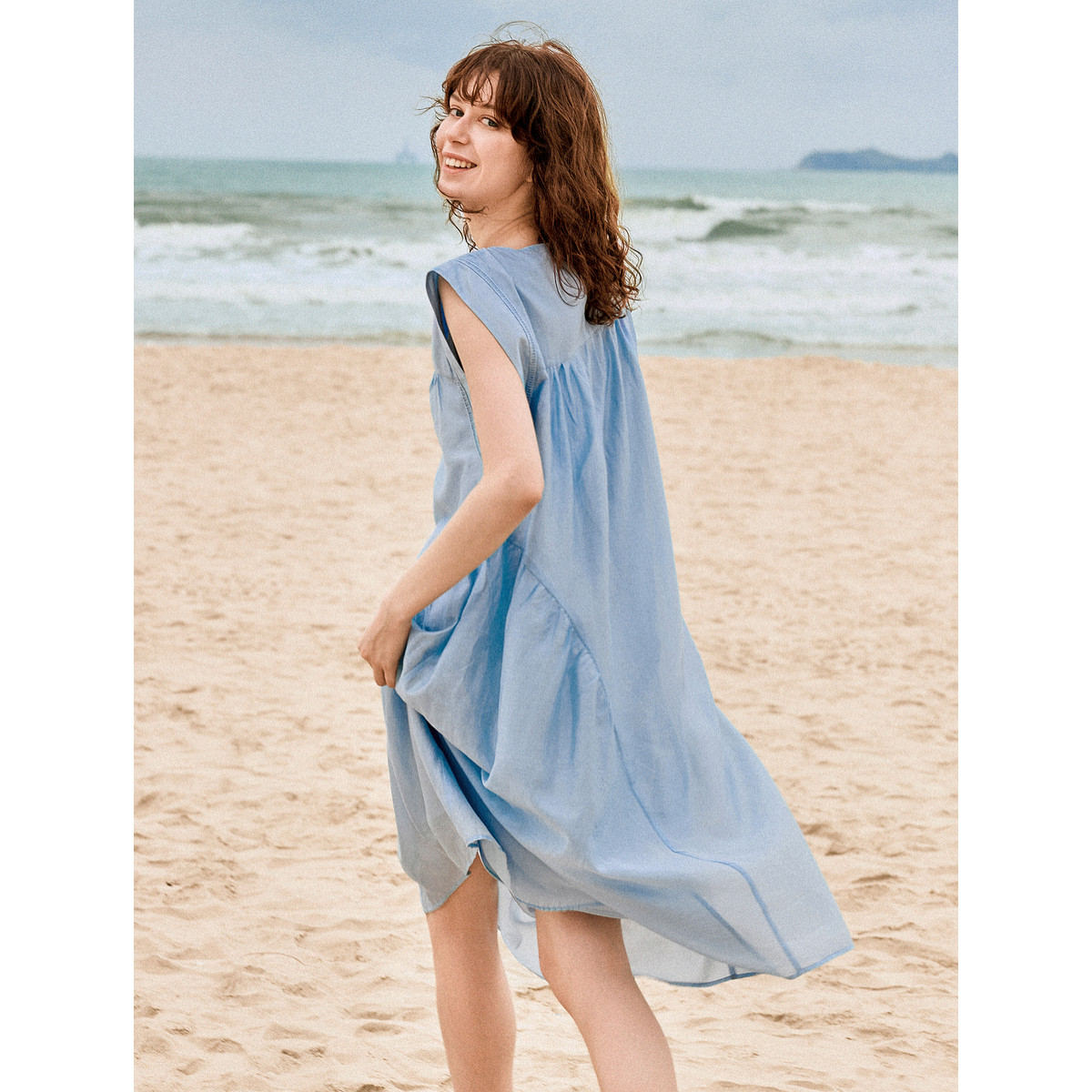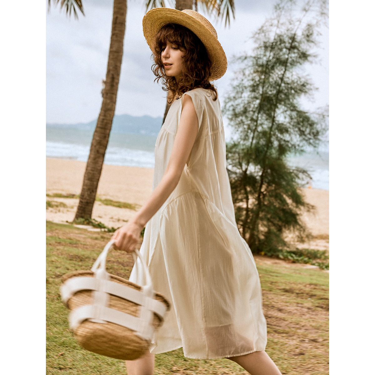 ELLE法式莱赛尔天丝连衣裙女2025夏季新款气质圆领米白色无袖裙子