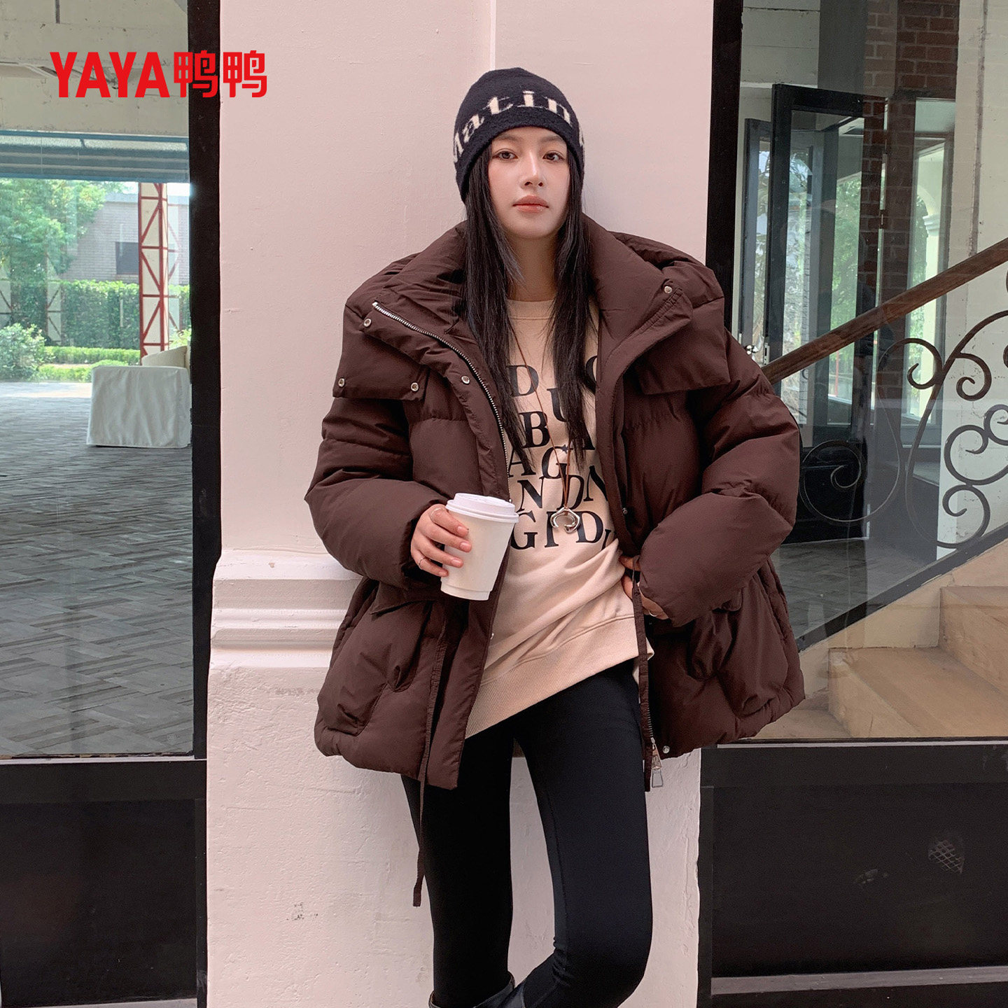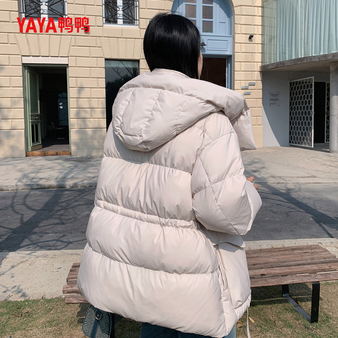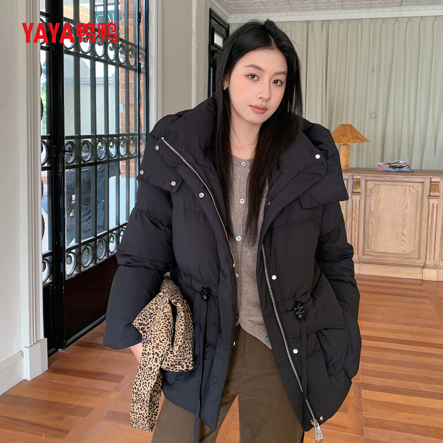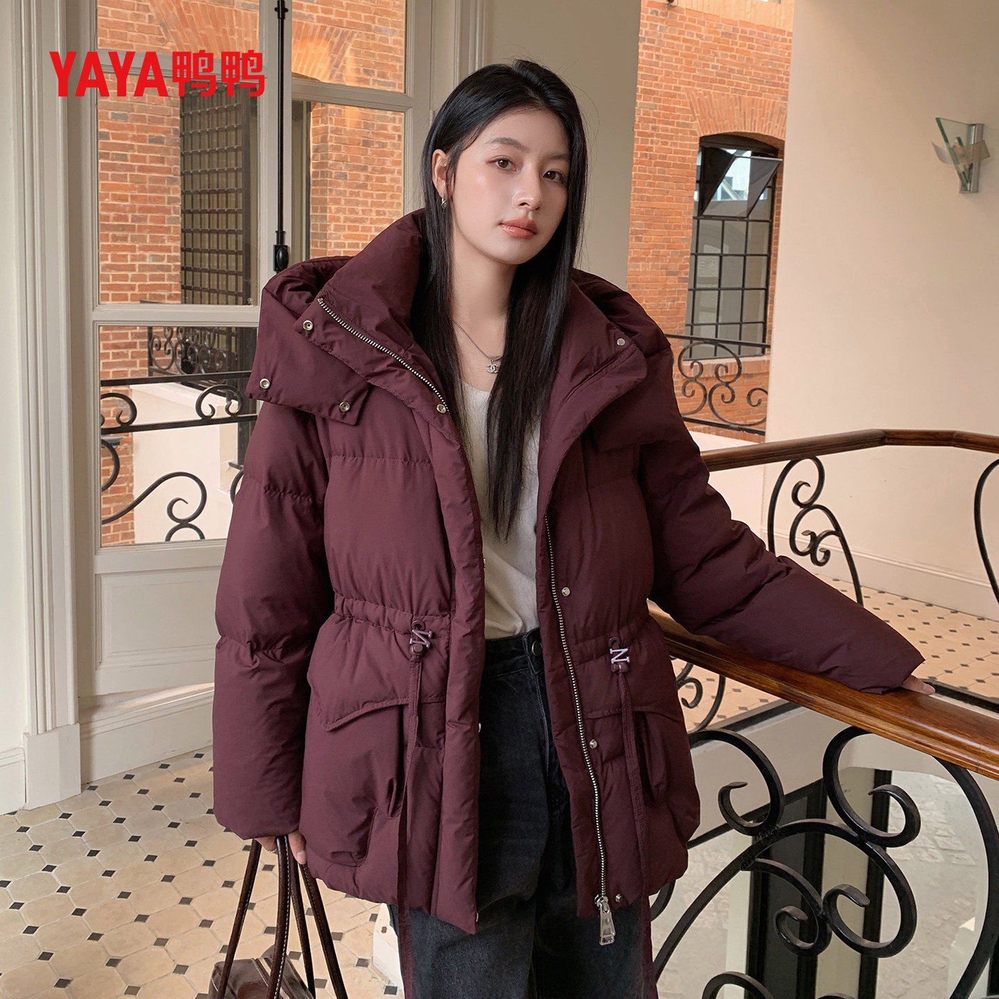 YAYA鸭鸭连帽中长款羽绒服女25冬季时尚宽松加厚丫丫鸭绒保暖外套