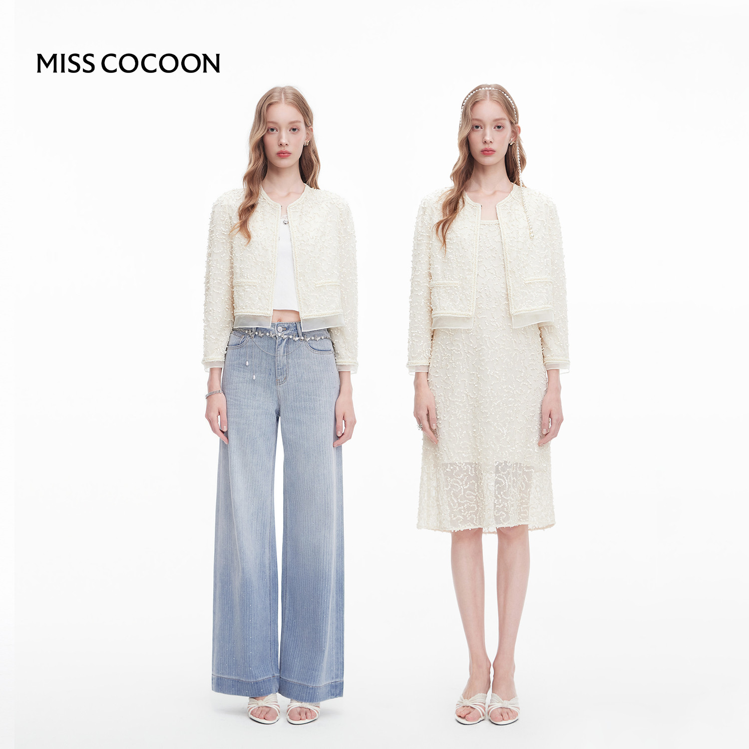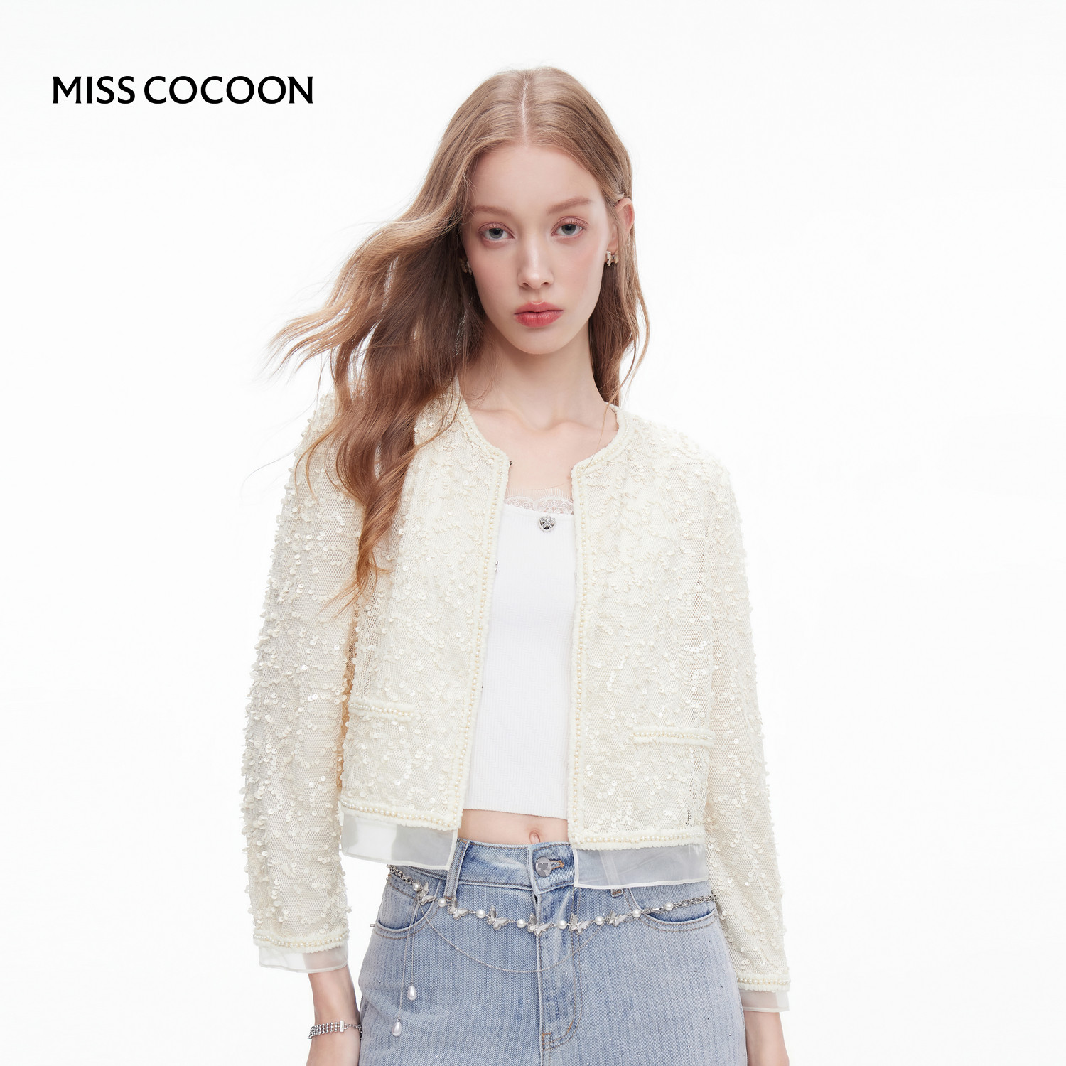 MISSCOCOON可可尼白色上衣女2025秋季新款小香风亮片小众短外套