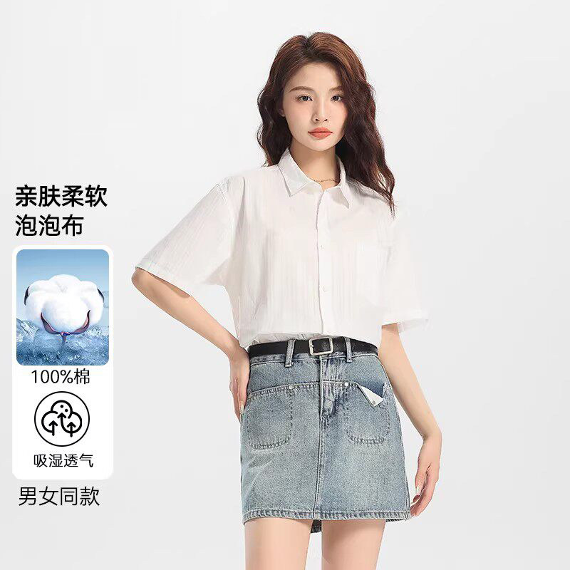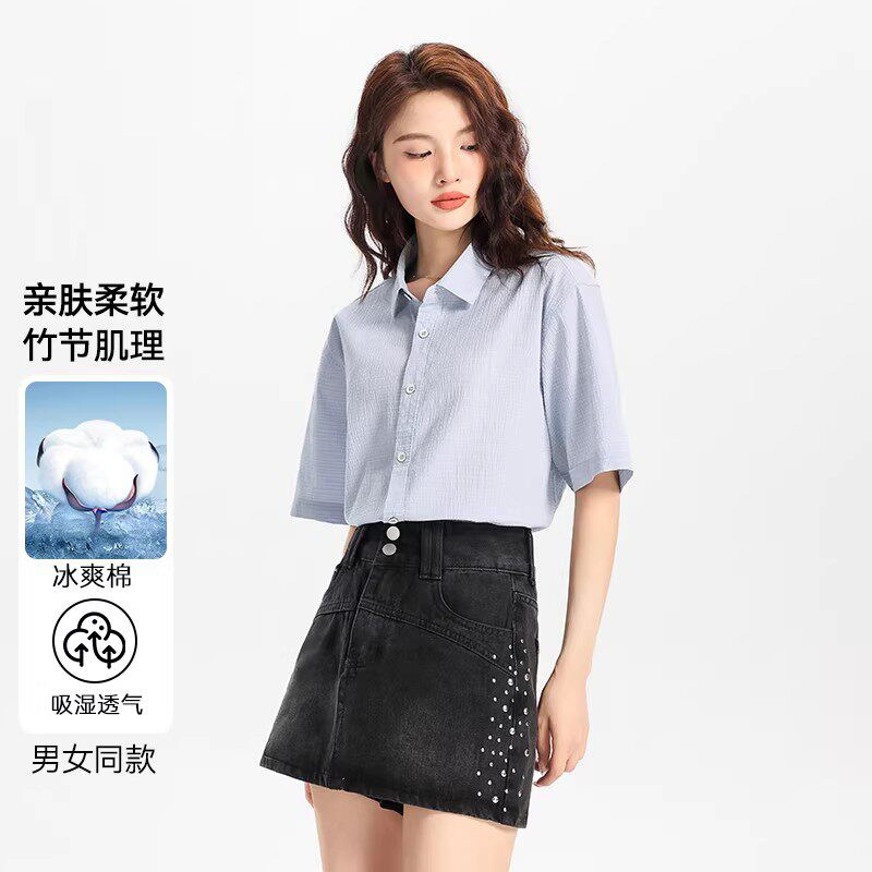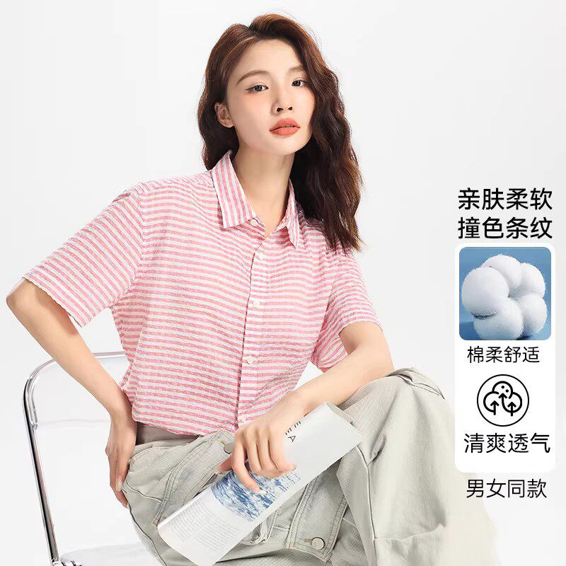 Artsdon/阿仕顿夏季款情侣日系条纹百搭宽松洋气半袖衬衫短袖衬衣