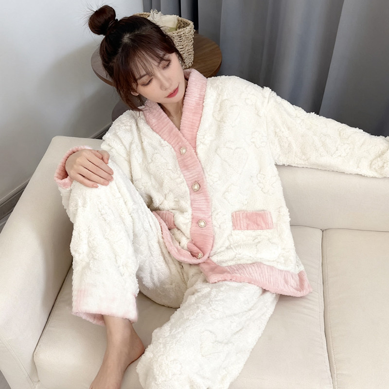 【清仓价】春长袖睡衣女双面舒棉绒开衫家居服套装大码长裤可外穿