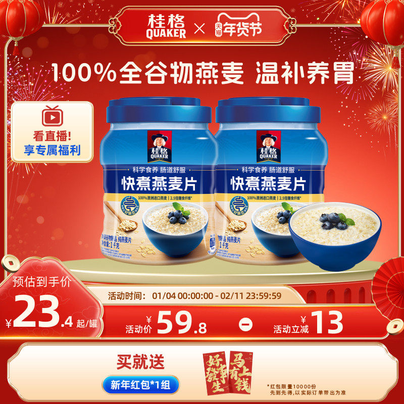 桂格快煮纯燕麦片冲饮谷物1000g*2罐原味煮食无白砂糖营养麦片