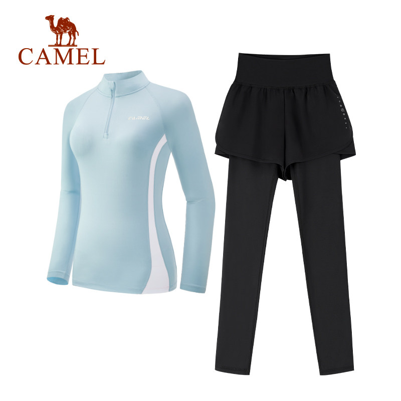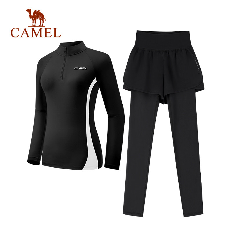 骆驼运动套装女春秋新款速干透气休闲立领上衣瑜伽健身假两件长裤