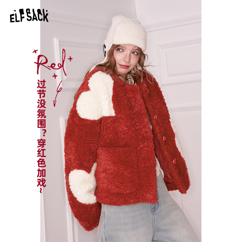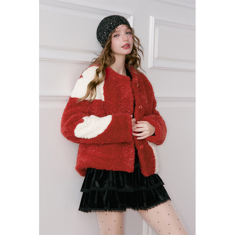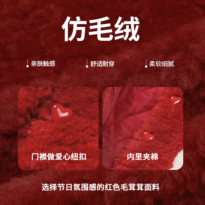 妖精的口袋仿毛绒短款夹棉毛呢外套女2025冬新款新年战袍红色上衣