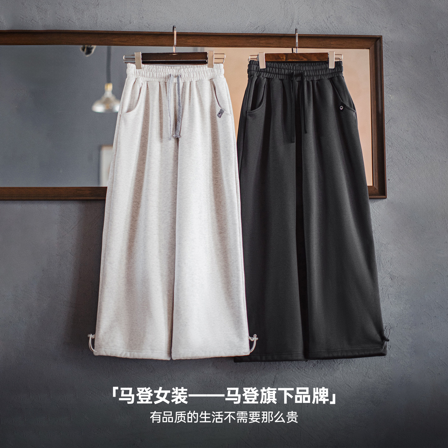马登灰色宽松直筒阔腿加绒厚实裤子休闲抽绳束脚保暖长卫裤女秋冬