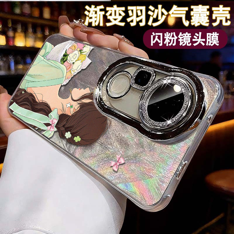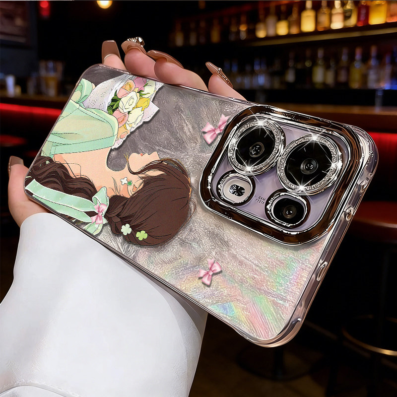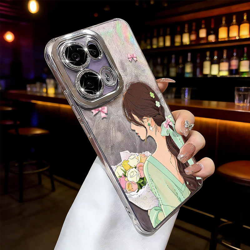 夏季清凉抱花女孩适用oppoa3手机壳reno12/15银色羽纱a56镭射findx7/x9pro闪镜头膜a5pro奢华a6/a93/a55/k12