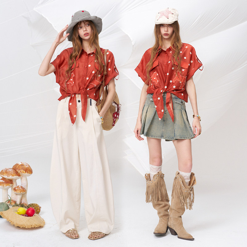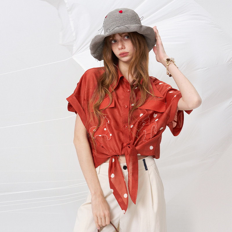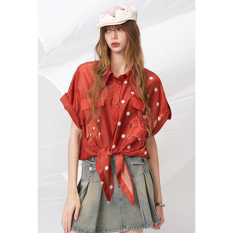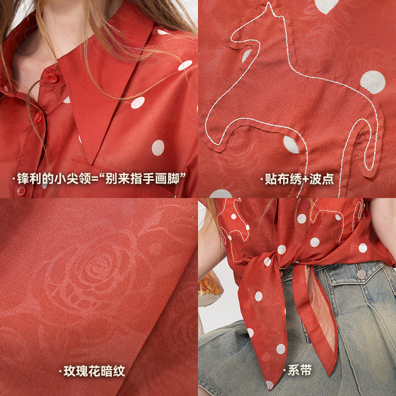 妖精的口袋波点系带红色短袖衬衫女2026夏季新款复古港风甜美上衣