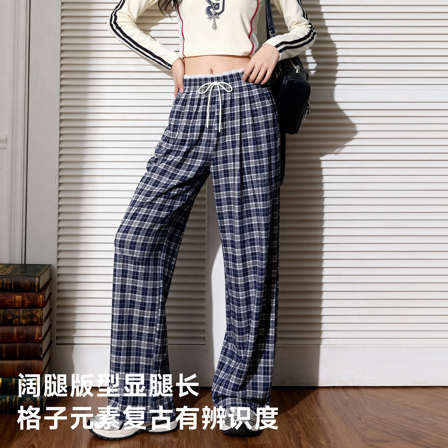 唐狮官方格纹阔腿裤女2026新款春秋款女士宽松显瘦休闲运动裤子VB