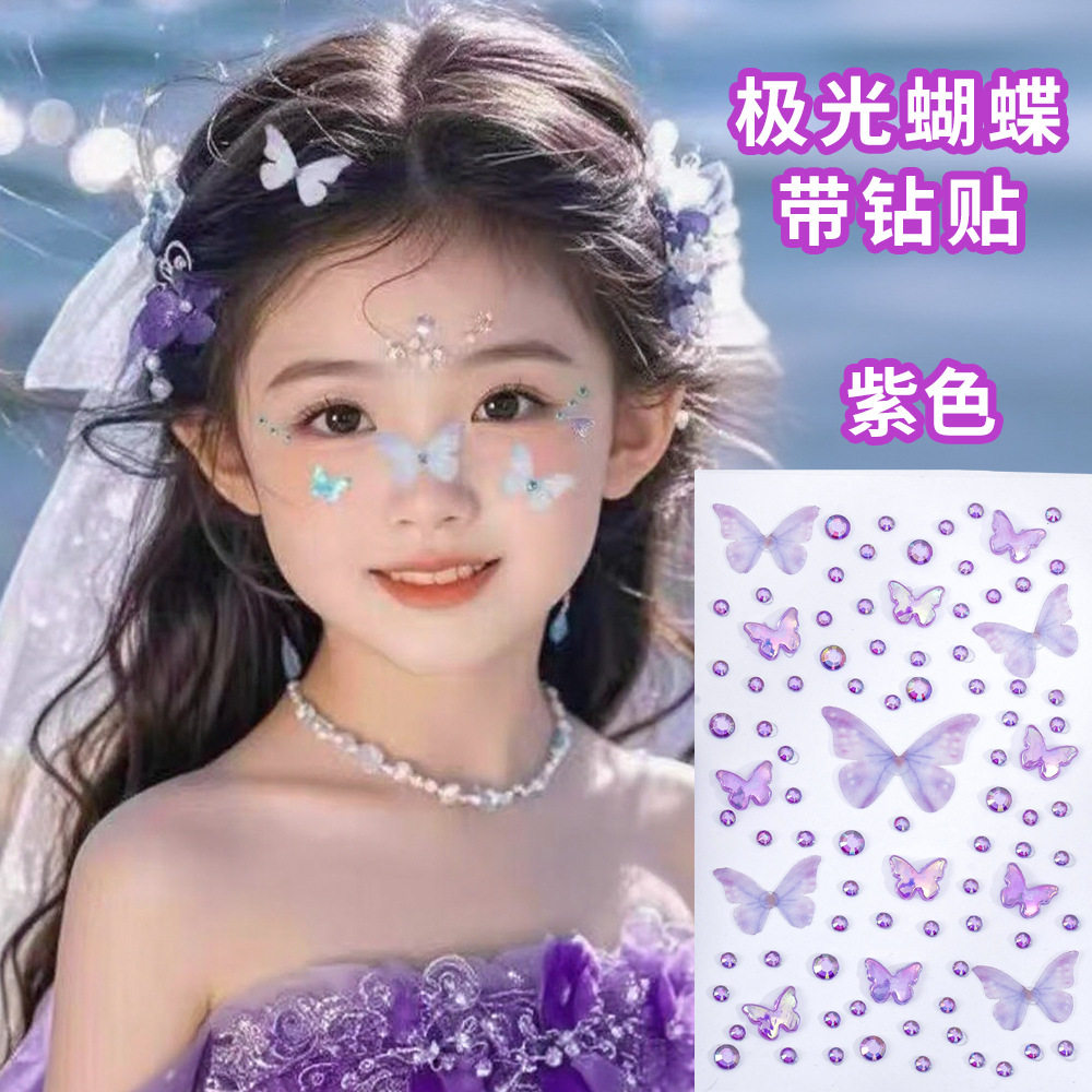 儿童立体蝴蝶带彩钻贴纸舞台表演妆造脸贴水钻贴纸闪亮片晶碎钻女孩超仙装饰面部妆容贴画演唱会写真拍照神器